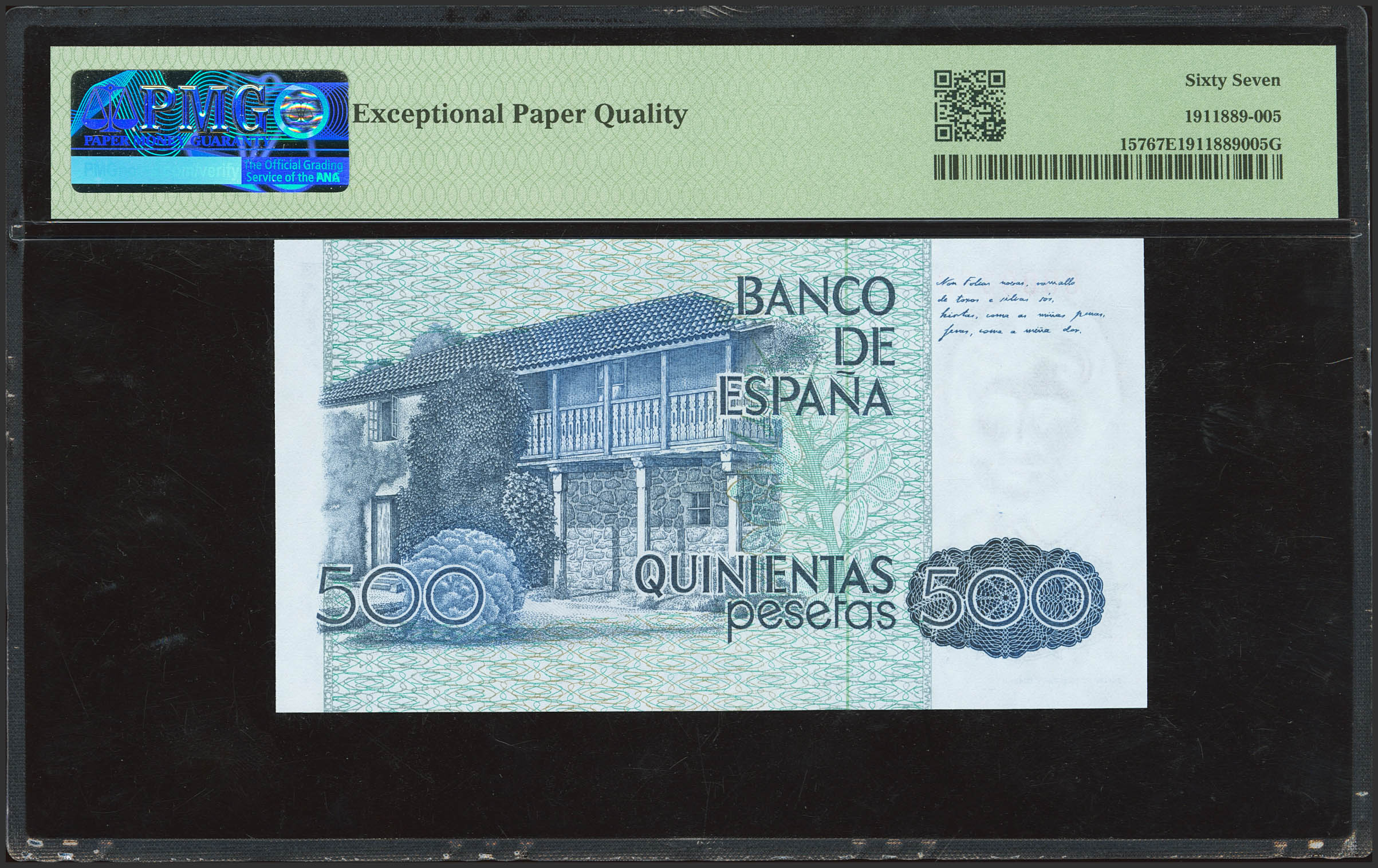 500 Pesetas. 20 de Octubre de 1979. Sin serie y numeración bajísima. (Edifil 2023: 476, Pick: 157). SC. Encapsulado PMG67EPQ.