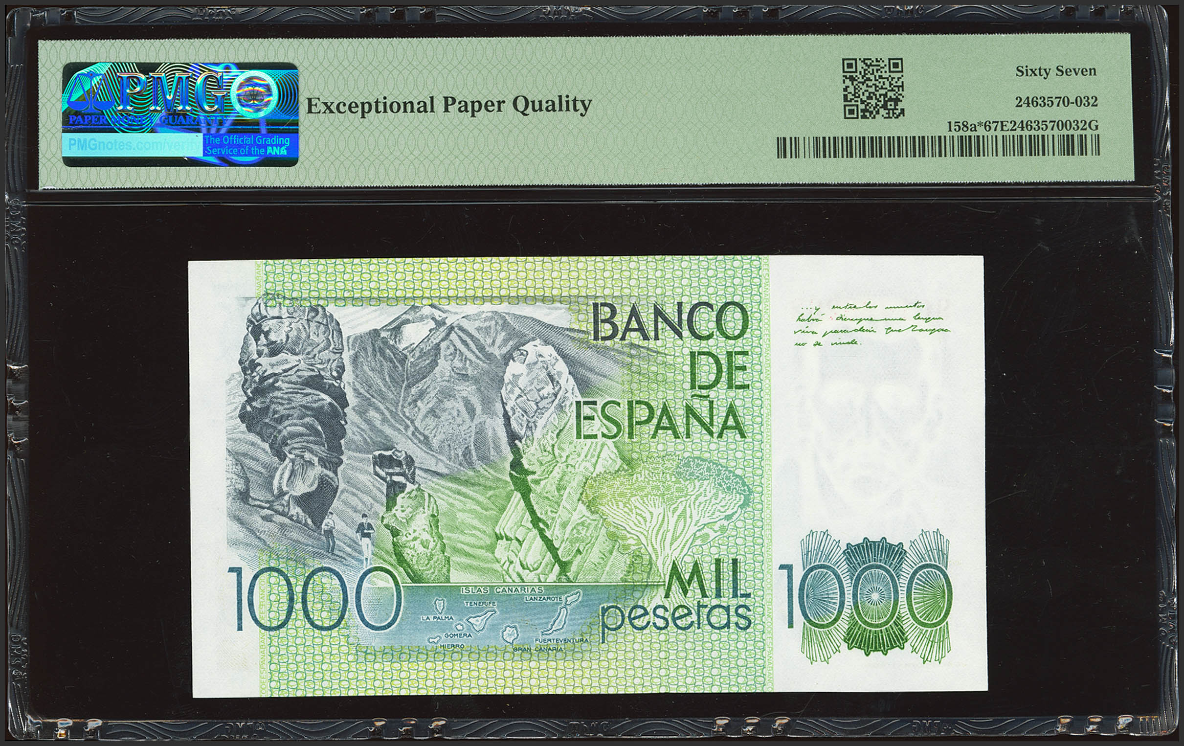 1000 Pesetas. 23 de Octubre de 1979. Serie especial 9C. (Edifil 2023: 477b, Pick: 158a*). SC. Raro en esta excepcional calidad. Encapsulado PMG67EPQ.