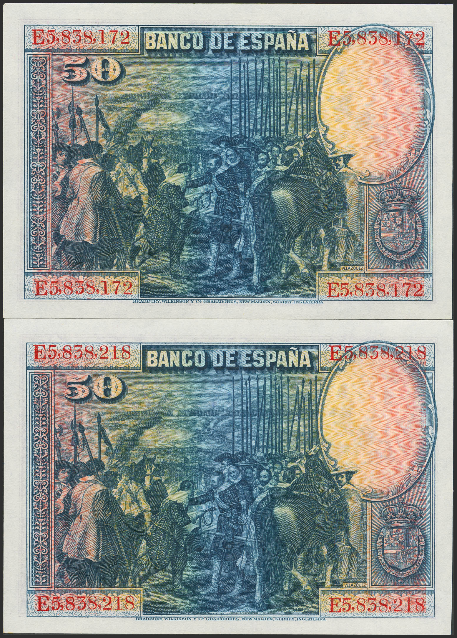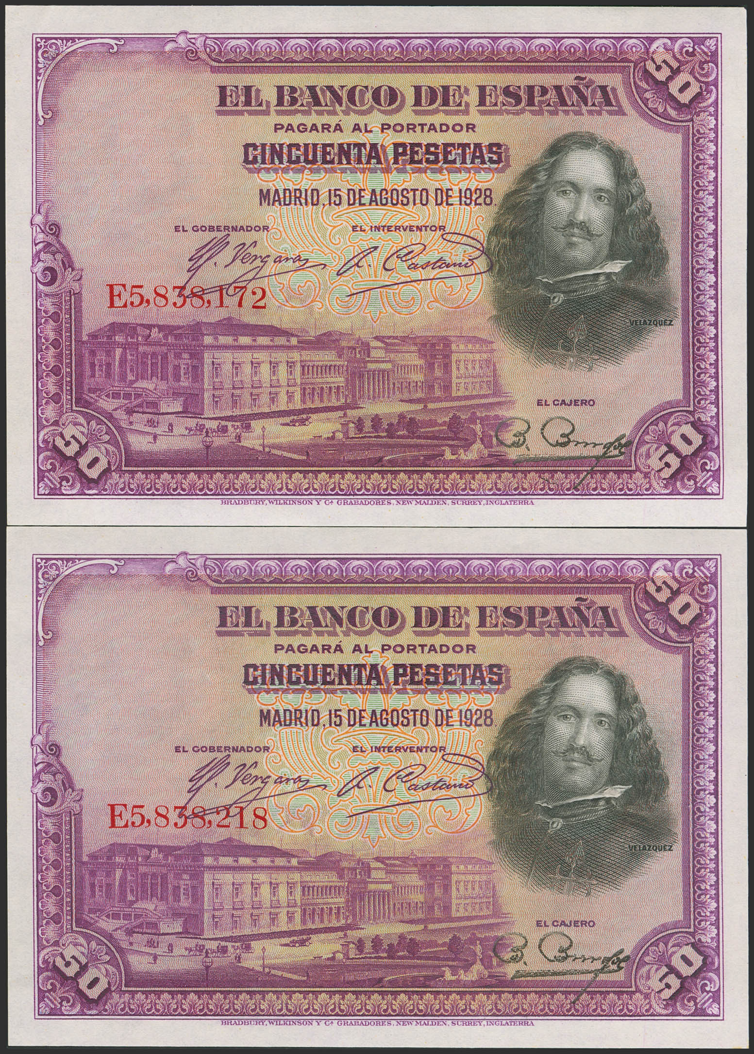 Conjunto de 2 billetes de 50 Pesetas emitidos el 15 de Agosto de 1928 con la serie E y numeración muy próxima entre ellos. (Edifil 2023: 354). Apresto original. SC/SC-.