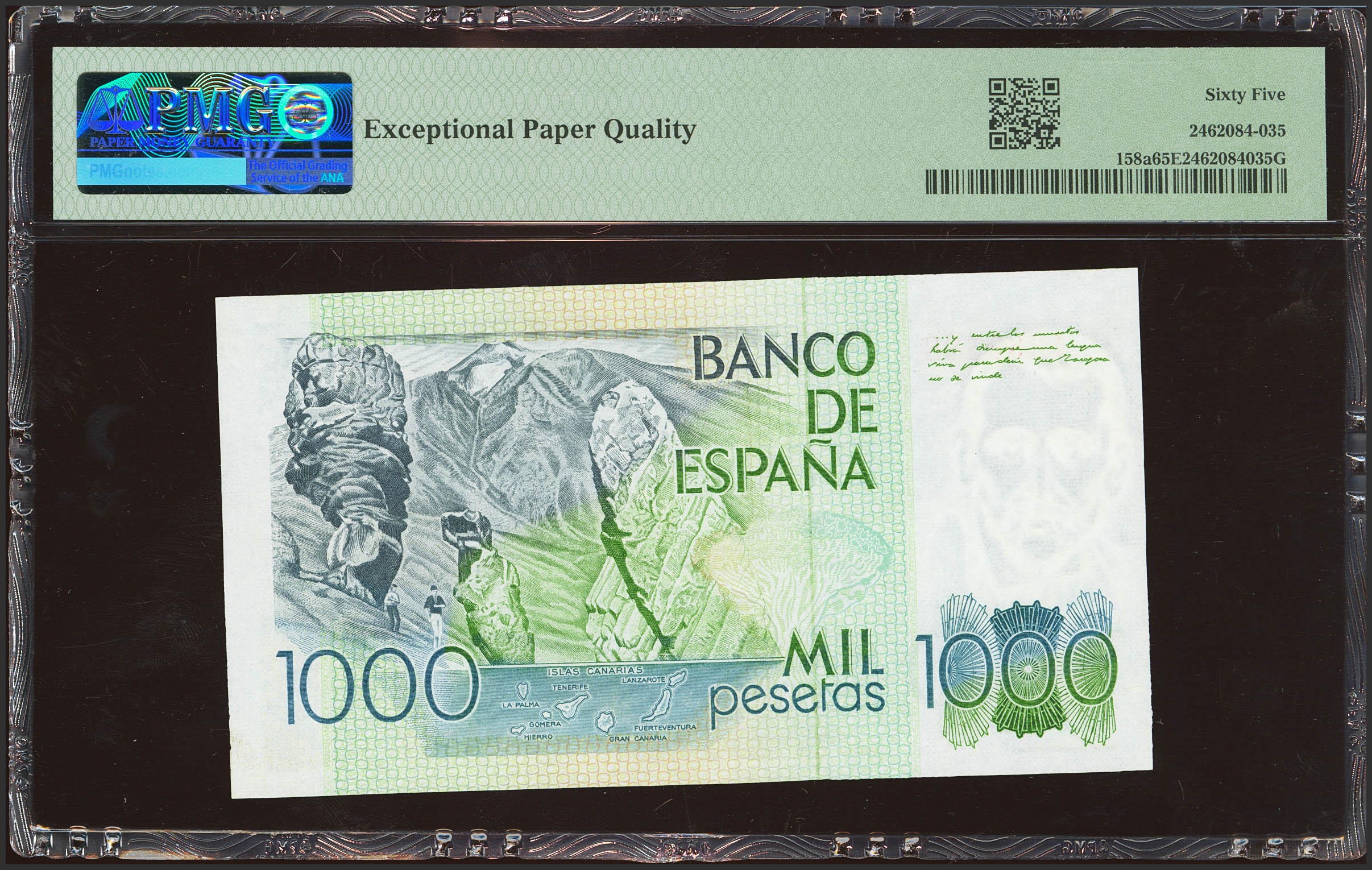 1000 Pesetas. 23 de Octubre de 1979. Sin serie. (Edifil 2023: 477, Pick: 158a). Apresto original. SC. Encapsulado PMG65EPQ.