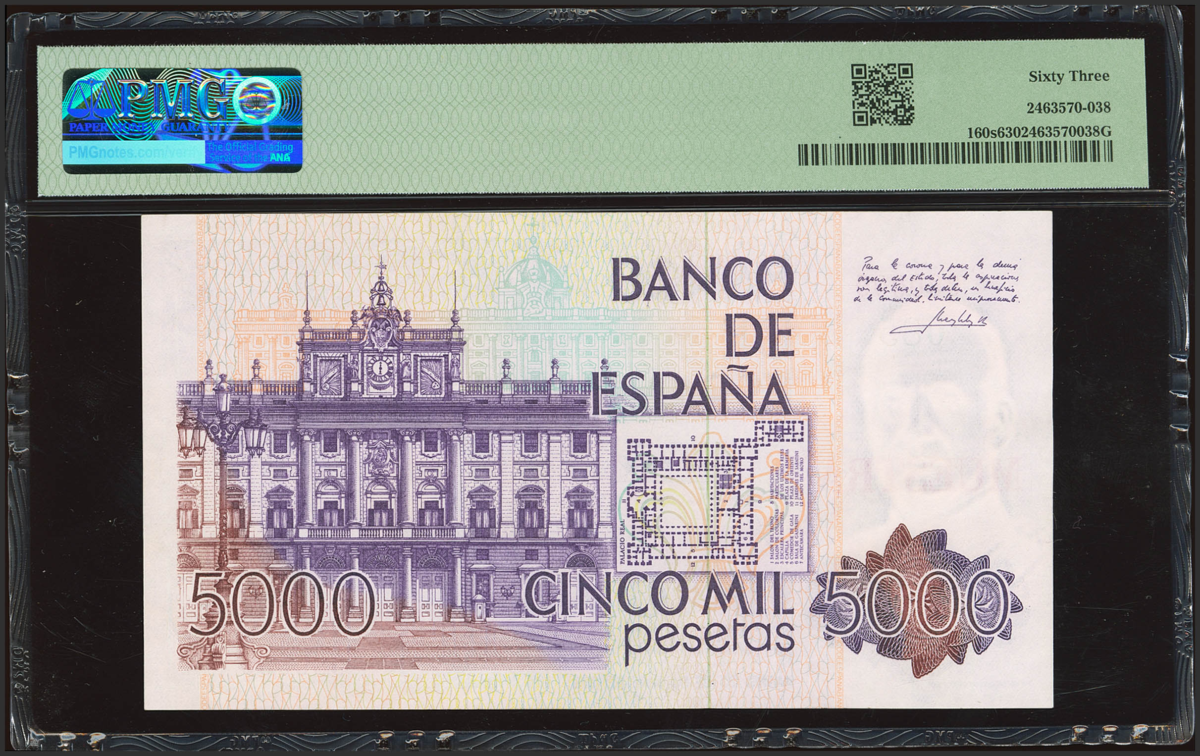 5000 Pesetas. 23 de Octubre de 1979. Sin serie. MUESTRA, serie 085 en verde y numeración 000000. (Edifil 2023: 478M). Raro. SC. Encapsulado PMG63.