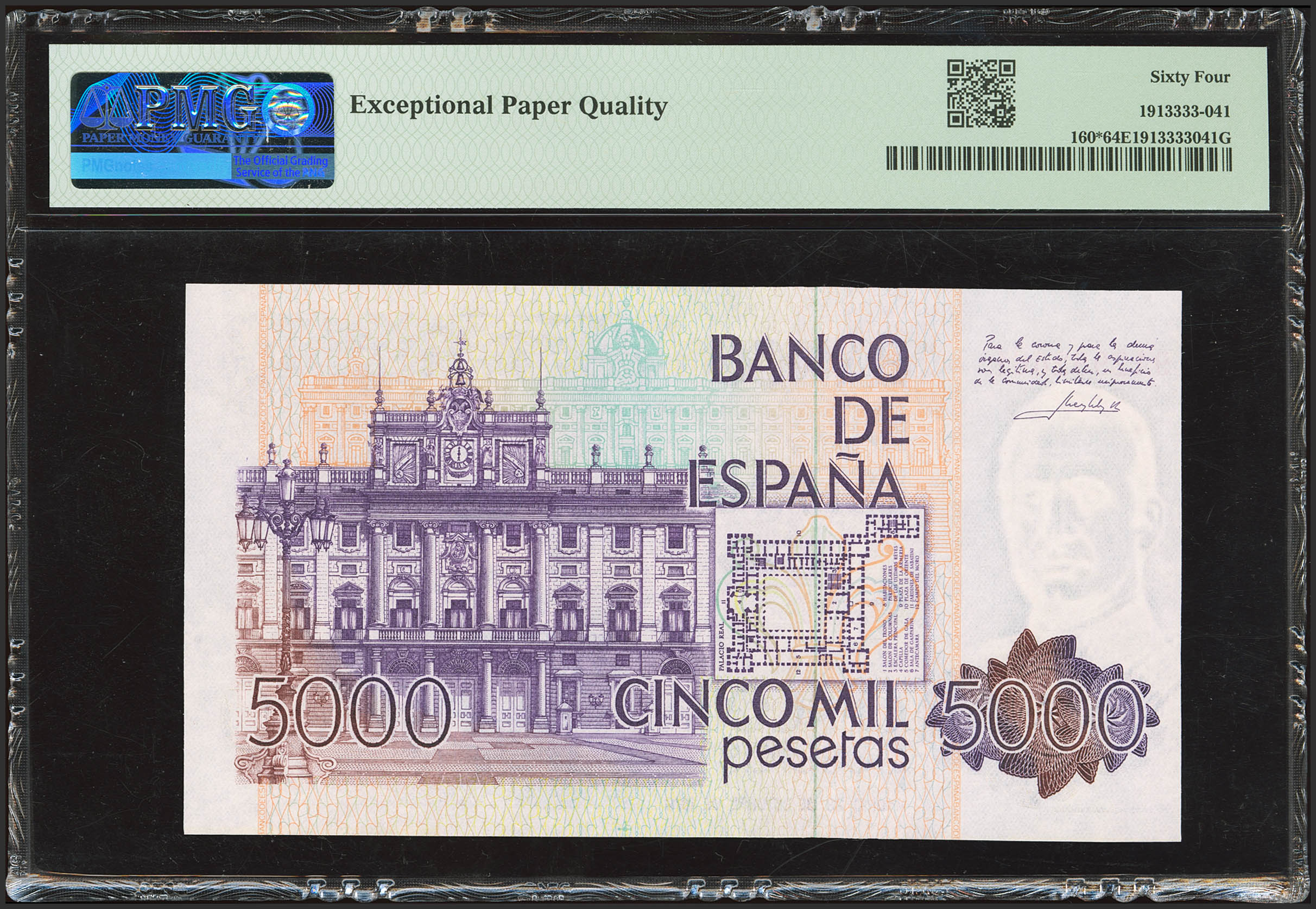 5000 Pesetas. 23 de Octubre de 1979. Serie especial 9A. (Edifil 2023: 478b, Pick: 160*). SC. Encapsulado PMG64EPQ.