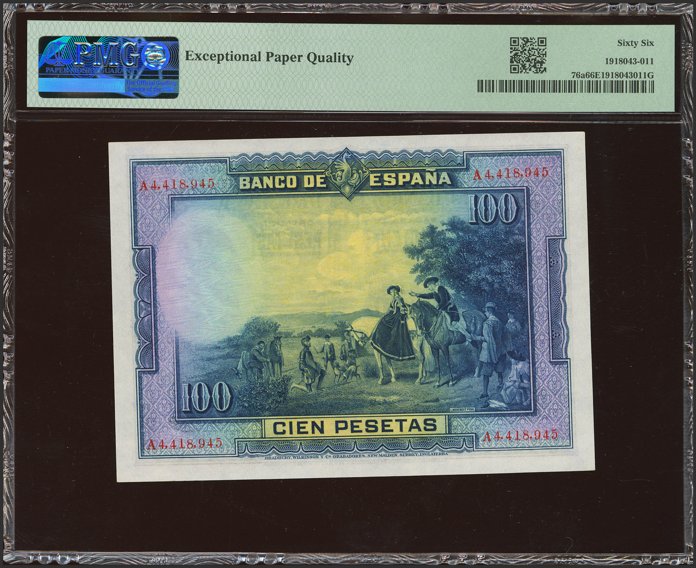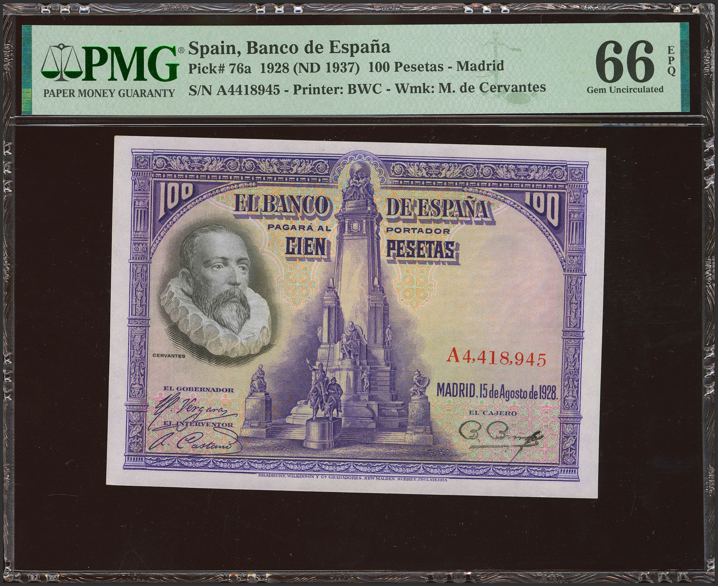 100 Pesetas. 15 de Agosto de 1928. Serie A. (Edifil 2023: 355a, Pick: 76a). Raro en esta excepcional calidad, apresto original. SC. Encapsulado PMG66EPQ.