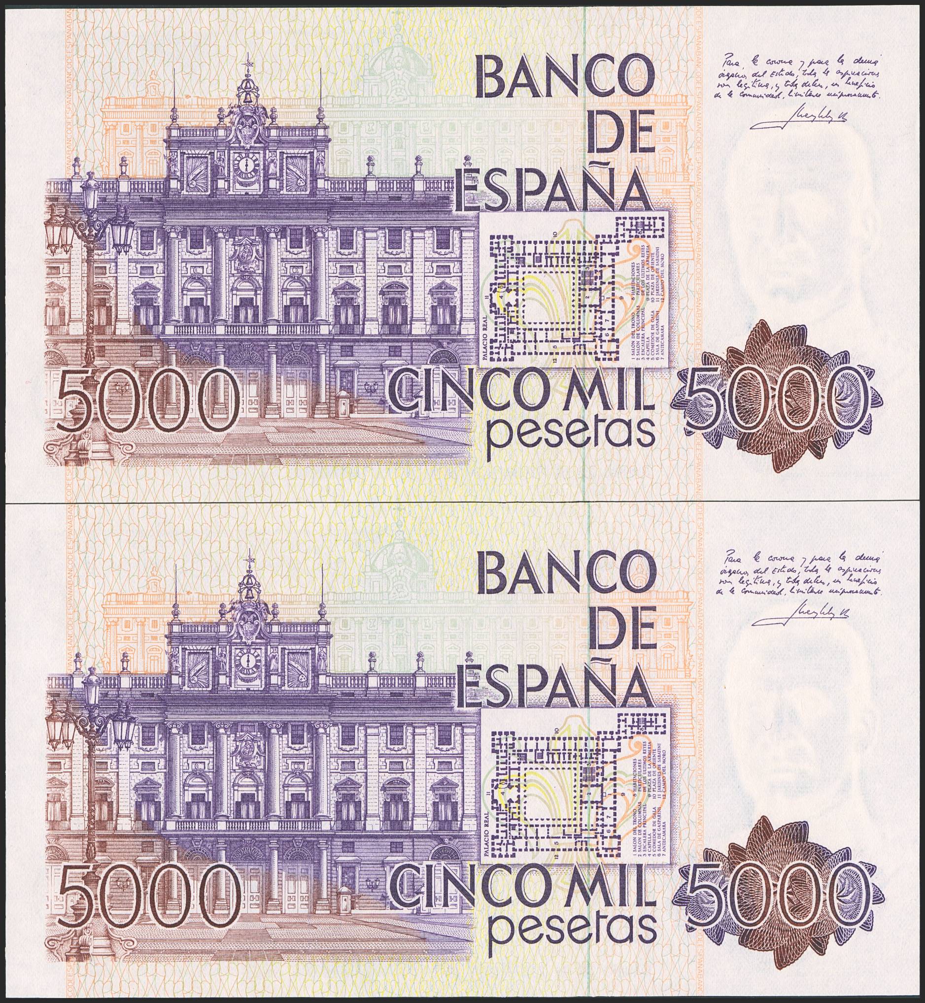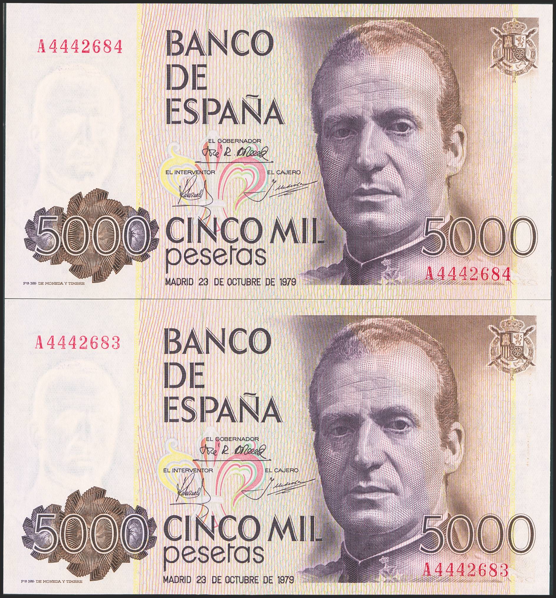 5000 Pesetas. 23 de Octubre de 1979. Pareja correlativa. Serie A. (Edifil 2023: 478a). SC.