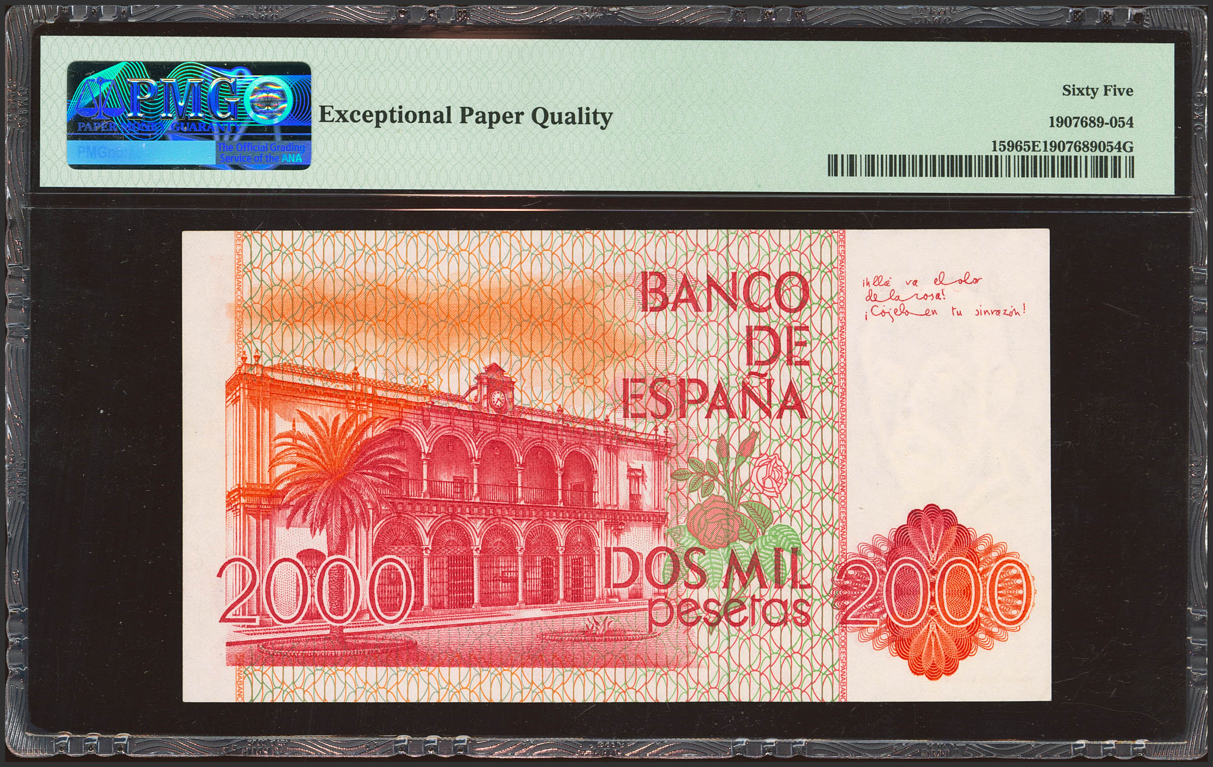 2000 Pesetas. 22 de Julio de 1980. Sin serie y numeración bajísima (0000774). (Edifil 2023: 479, Pick: 162). Muy raro. SC. Encapsulados PMG65EPQ.