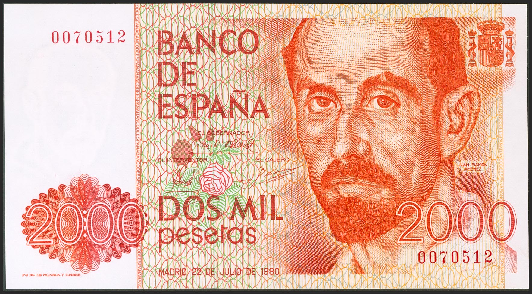 2000 Pesetas. 22 de Julio de 1980. Sin serie y numeración muy baja. (Edifil 2021: 479). SC.