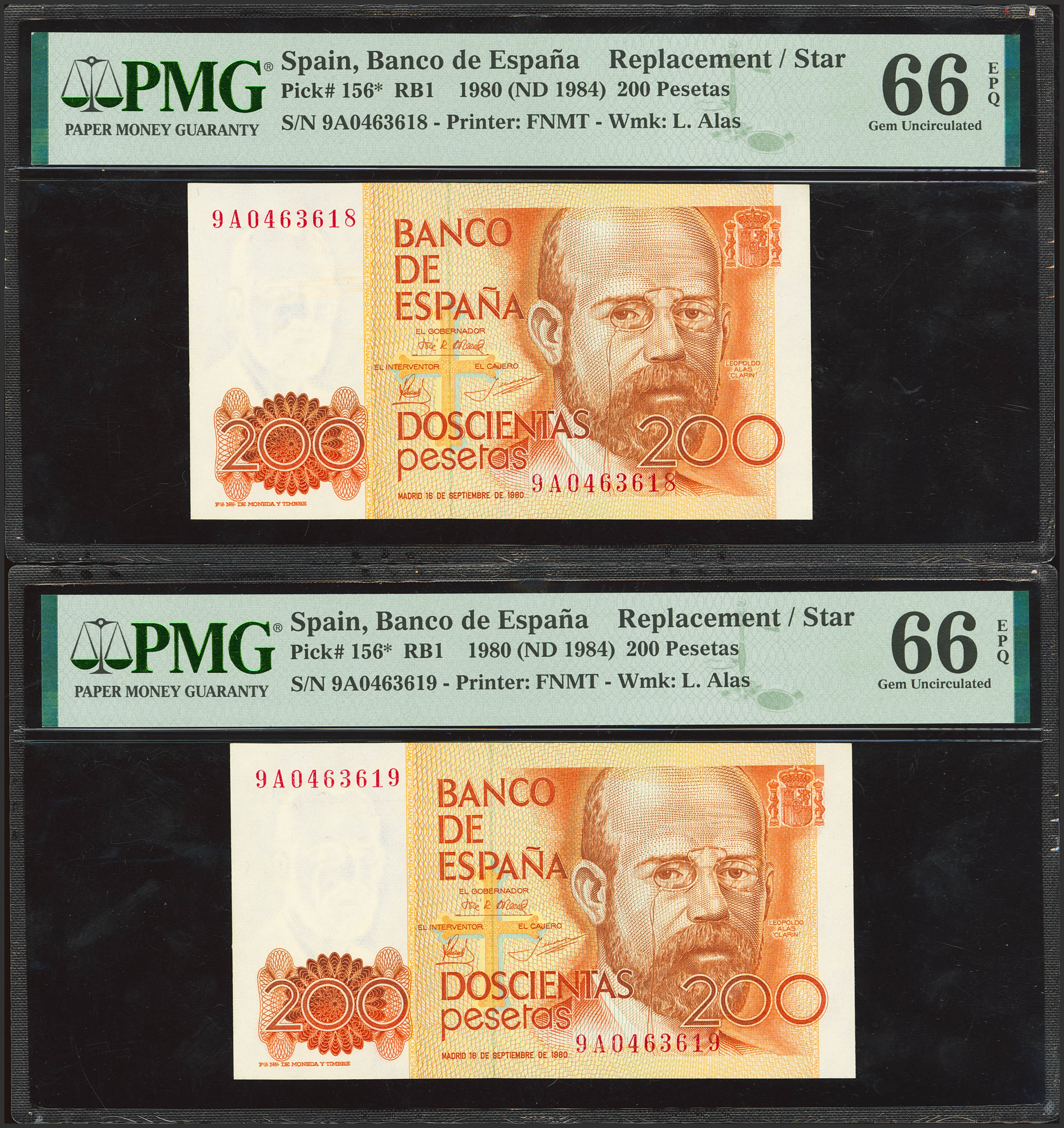 200 Pesetas. 16 de Septiembre de 1980. Pareja correlativa. Serie especial 9A. (Edifil 2023: 480b, Pick: 156*). SC. Encapsulados PMG66EPQ, ambos.