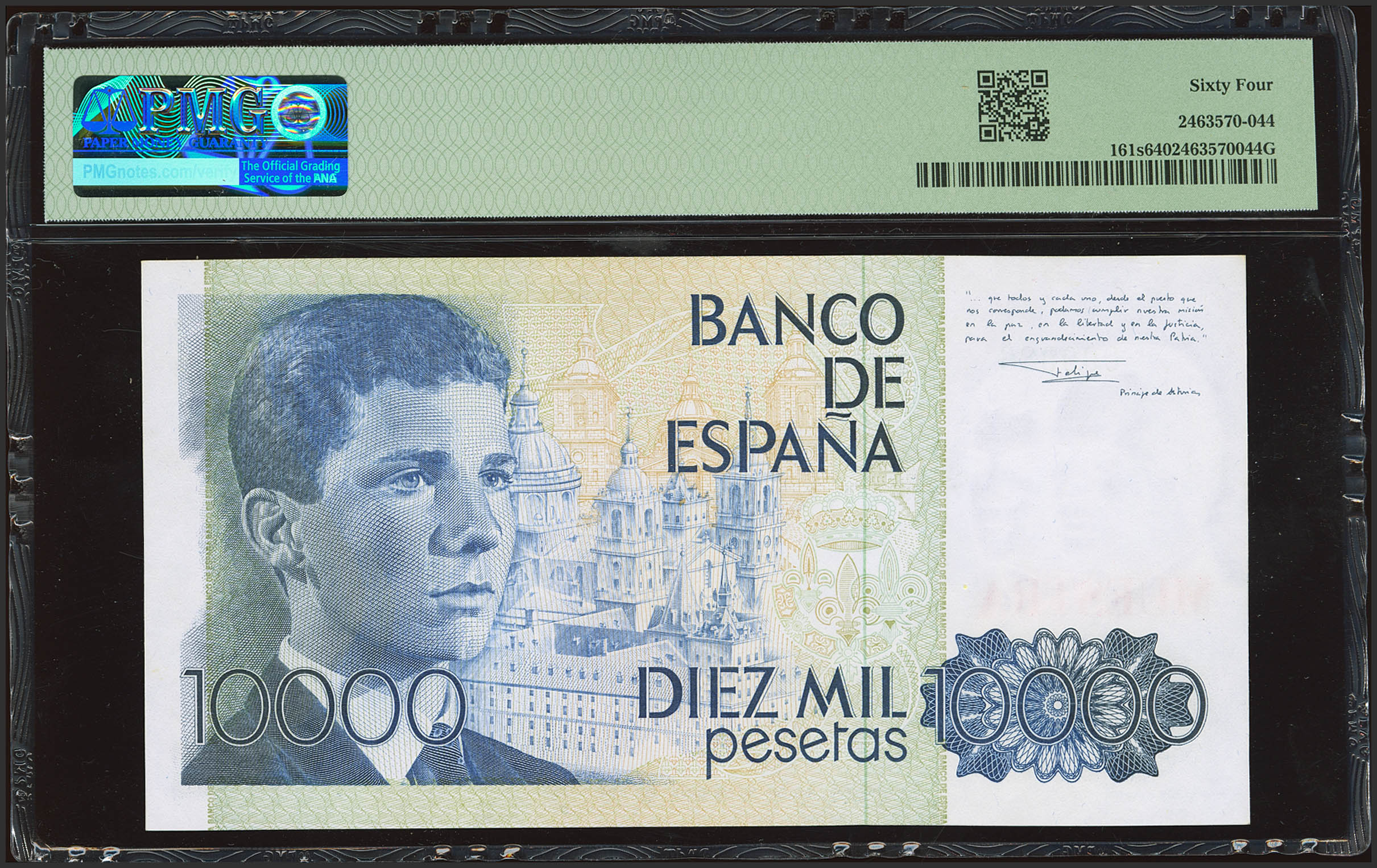 10000 Pesetas. 24 de Septiembre de 1985. Sin serie. MUESTRA, serie 000086 en verde y numeración 000000. (Edifil 2023: 481M). Raro. SC. Encapsulado PMG64.