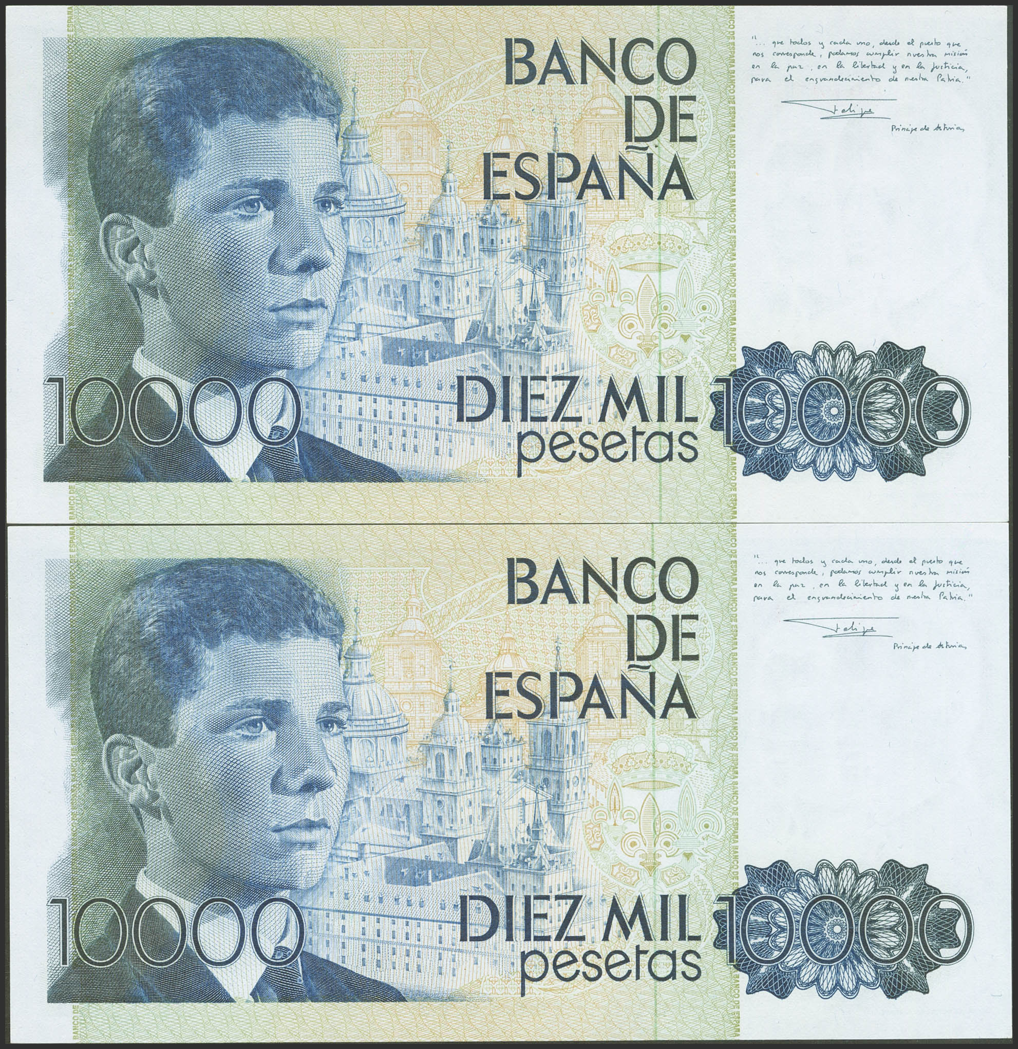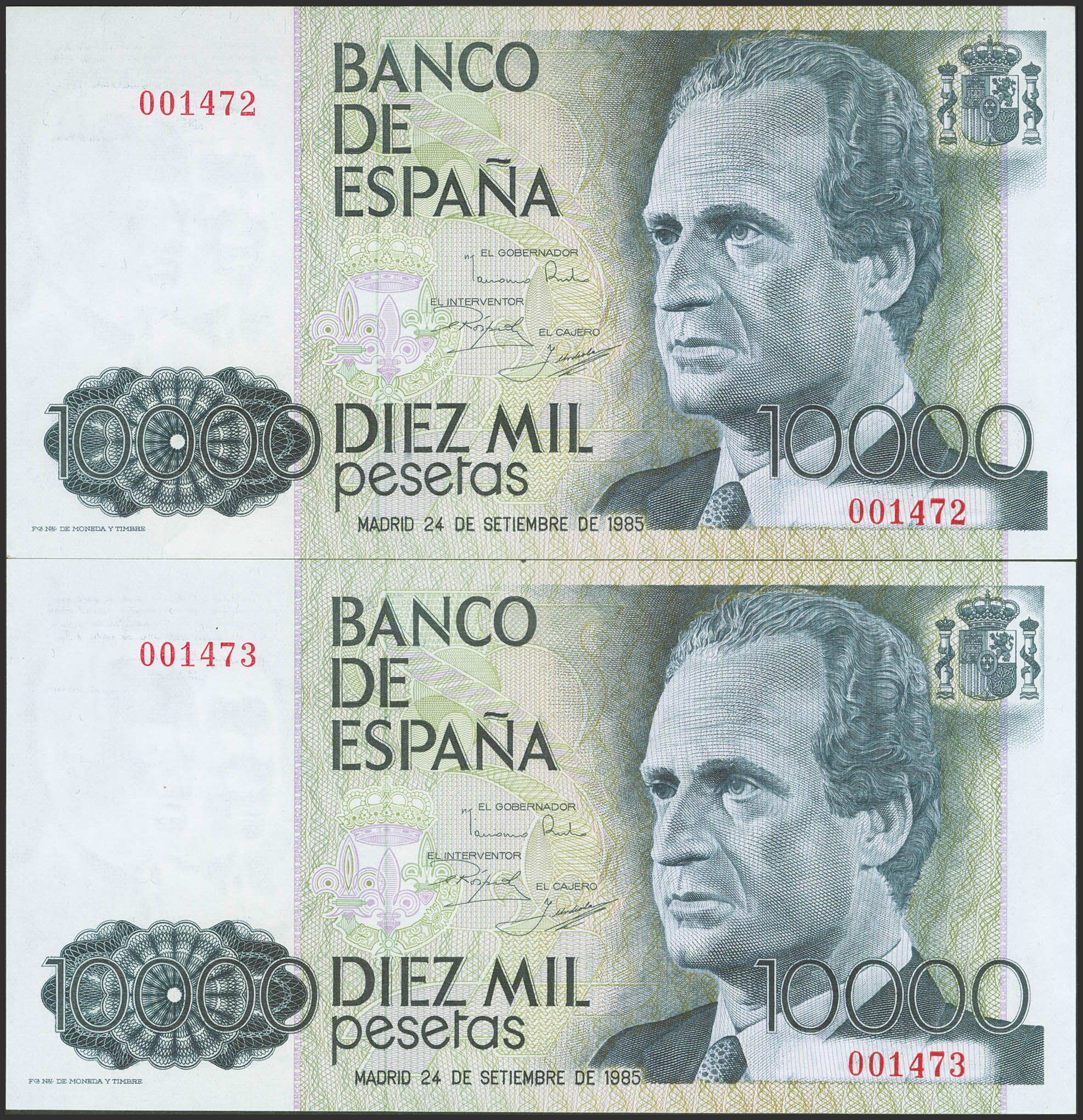 10000 Pesetas. 24 de Septiembre de 1985. Pareja correlativa. Sin serie y numeración muy baja. (Edifil 2021: 481). SC-.