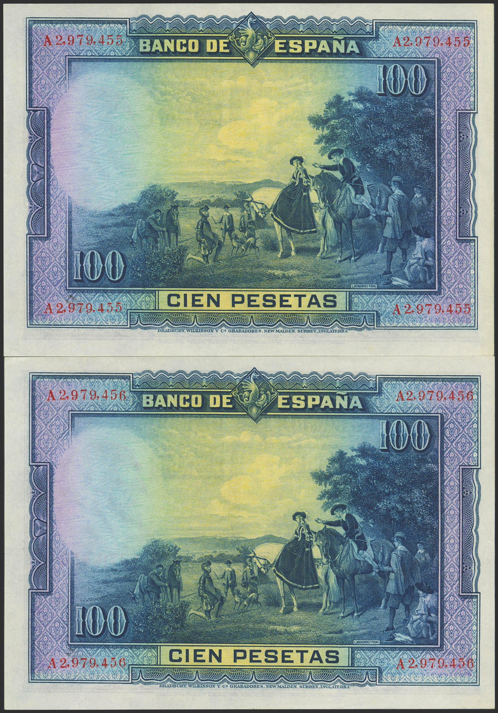 100 Pesetas. 15 de Agosto de 1928. Pareja correlativa. Serie A. (Edifil 2023: 355a). Conservan gran parte de su apresto original. EBC+++.