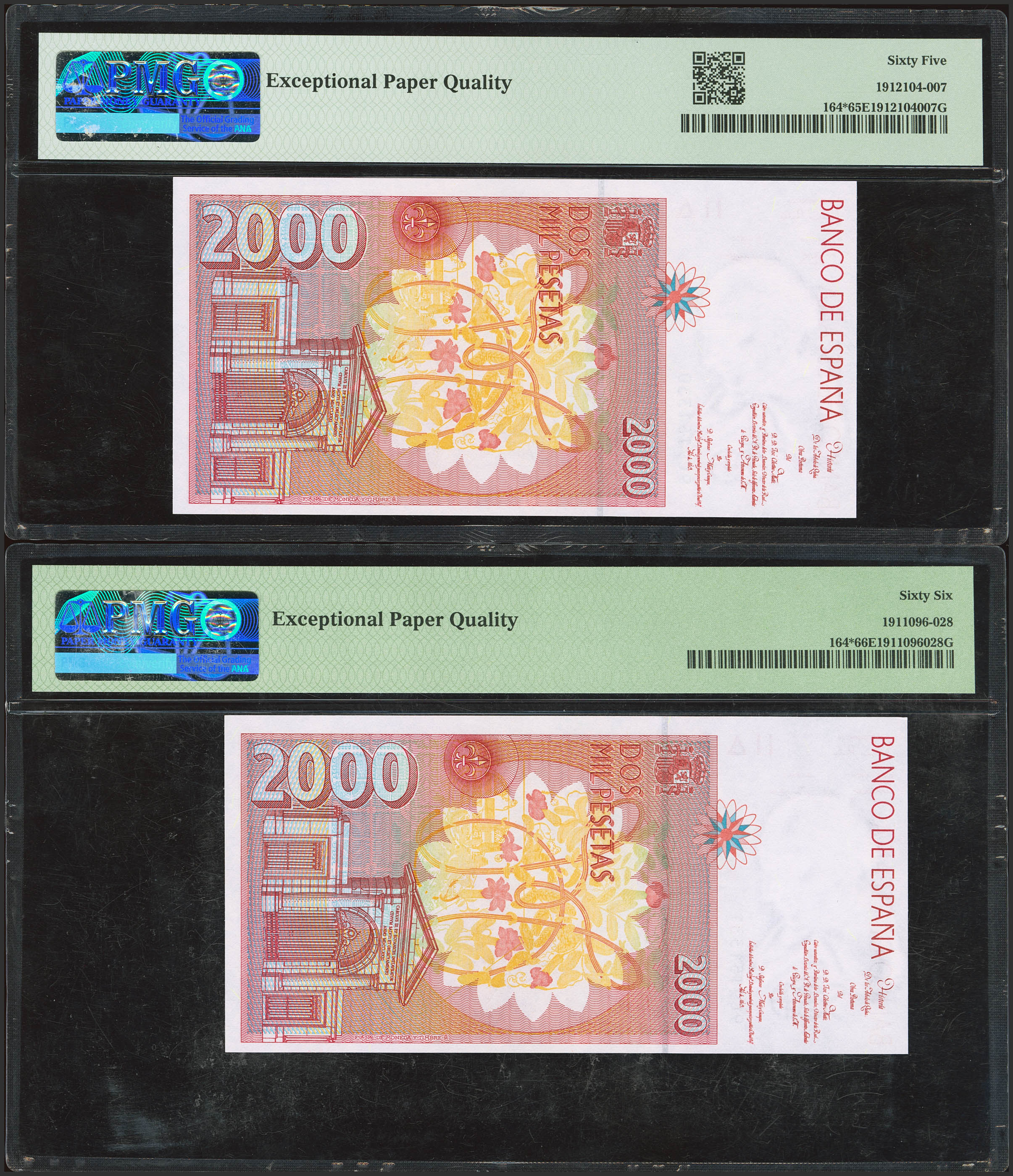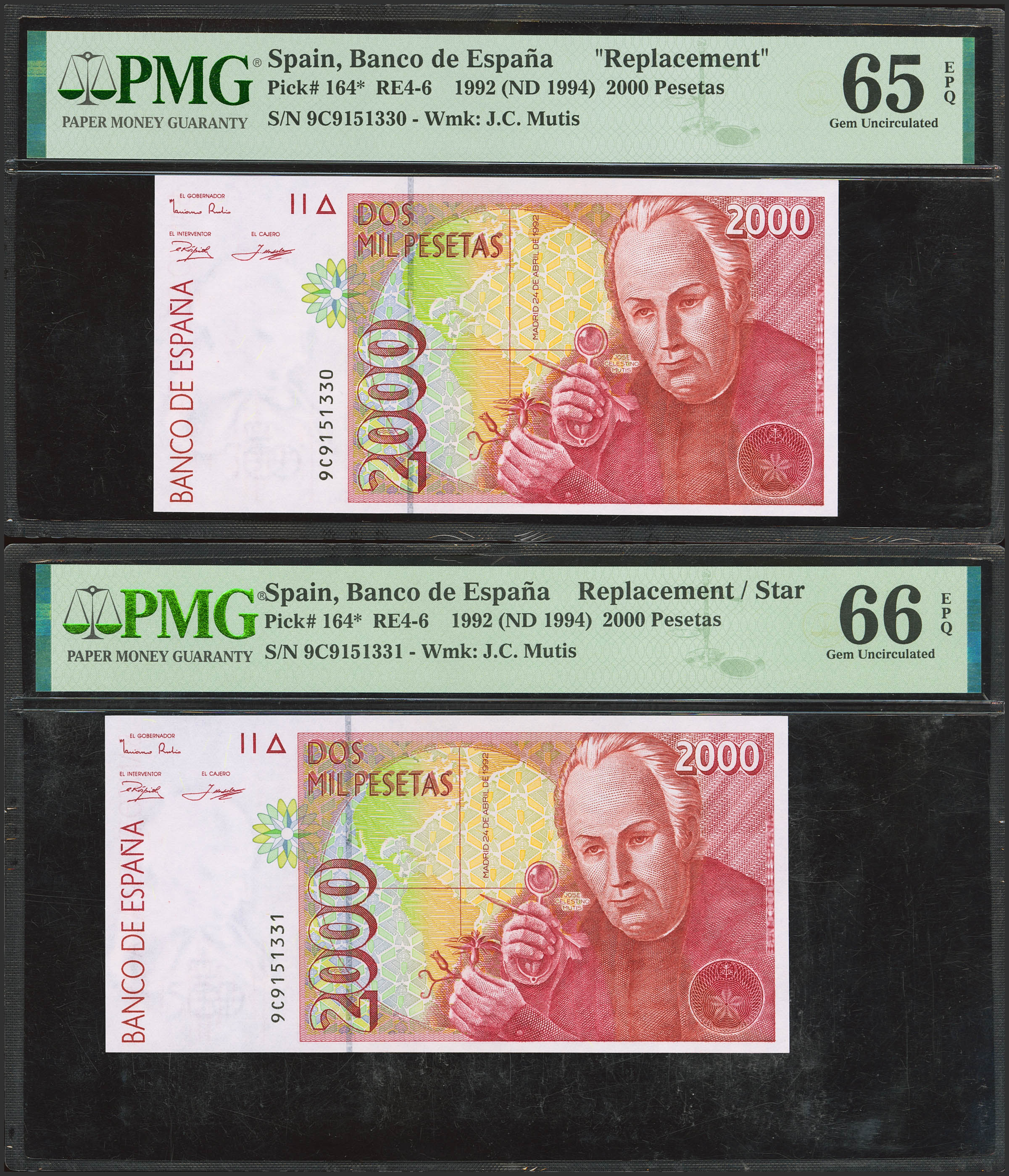 2000 Pesetas. 24 de Abril de 1992. Pareja correlativa. Serie especial 9C. (Edifil 2023: 482Ad, Pick: 164*). SC. Encapsulados PMG65EPQ/66EPQ.