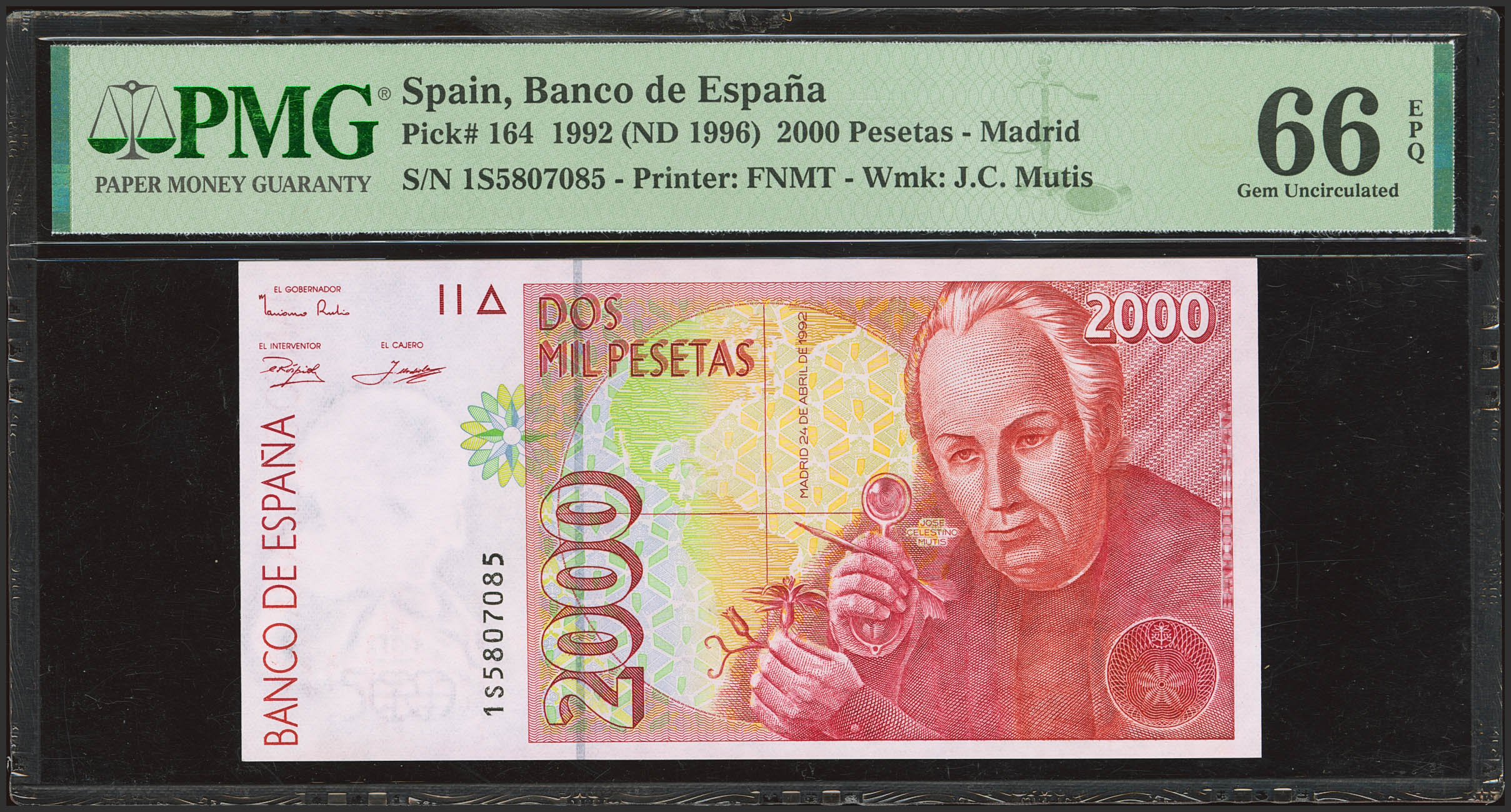 2000 Pesetas. 24 de Abril de 1992. Serie 1S y numeración capicúa. (Edifil 2023: 482A, Pick: 164). SC. Encapsulado PMG66EPQ (radar serial number).