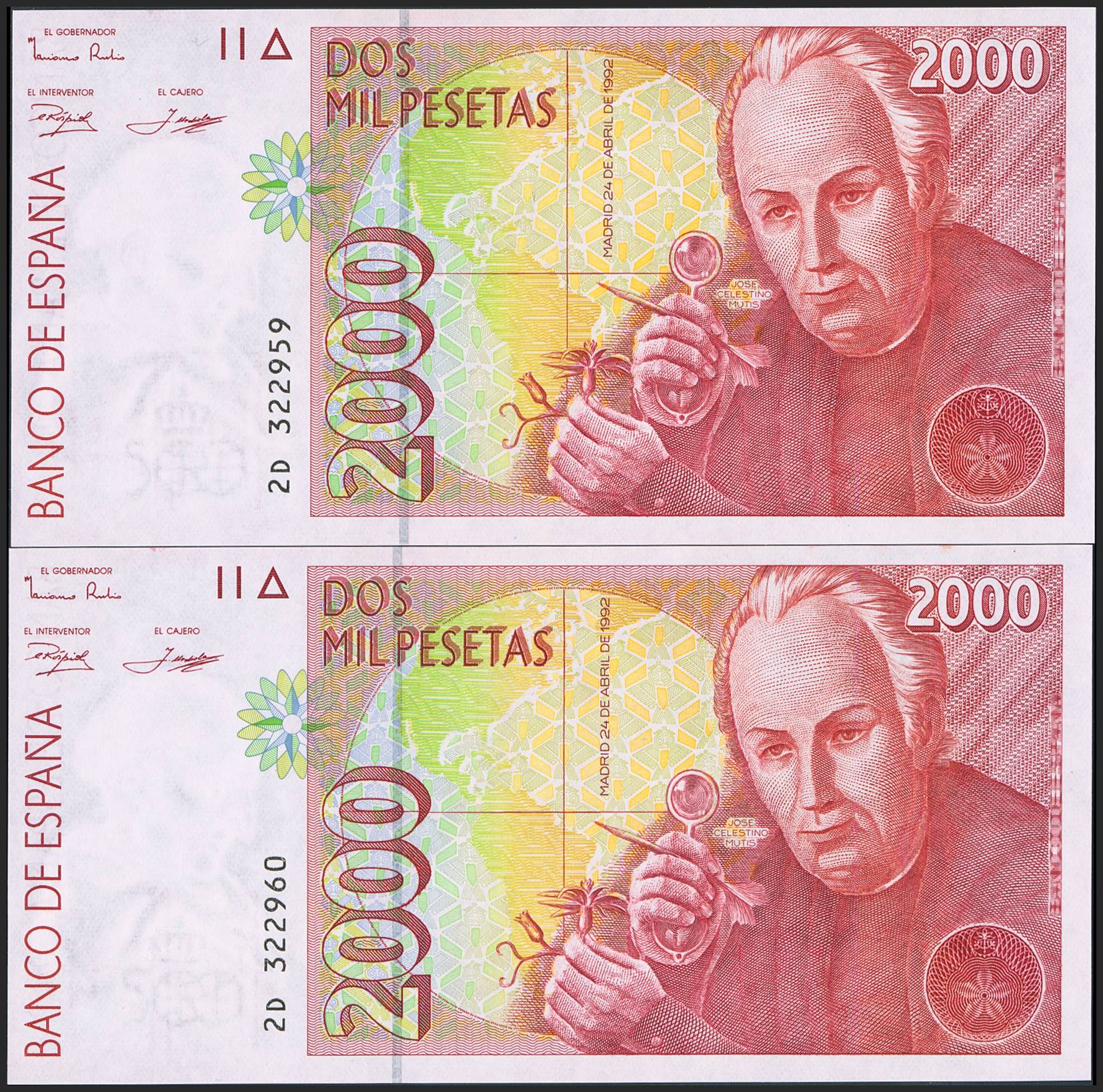 2000 Pesetas. 24 de Abril de 1992. Pareja correlativa. Serie 2D. (Edifil 2023: 482Aa). SC.