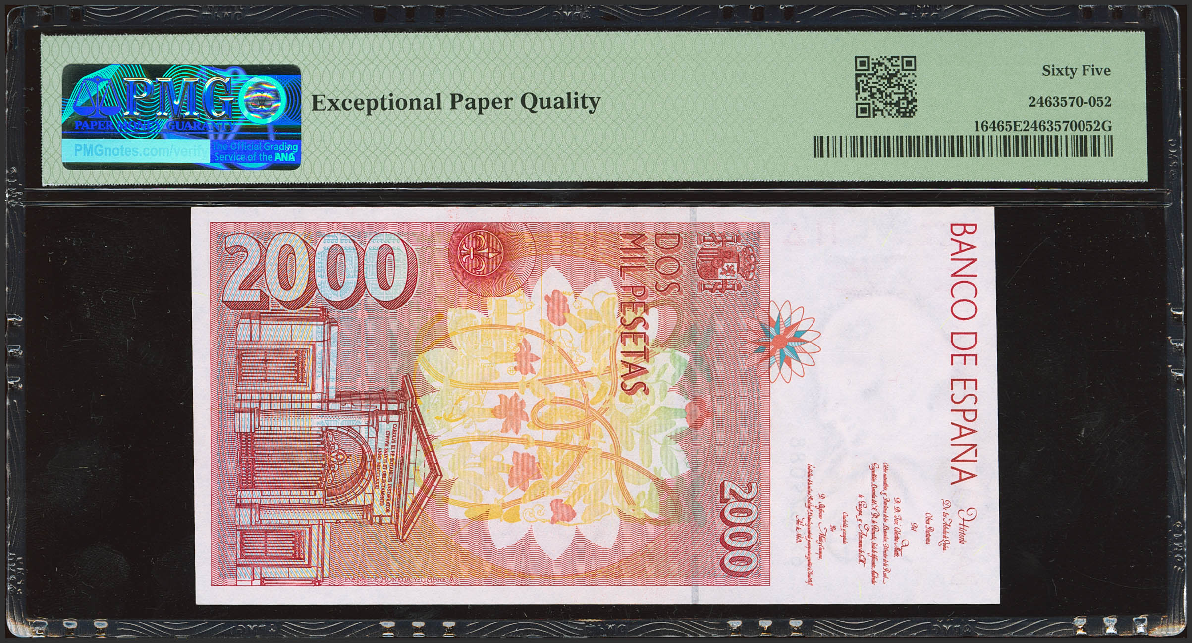 2000 Pesetas. 24 de Abril de 1992. Serie 6X, última serie emitida (diseño modificado en 1995). (Edifil 2023: 482Ac, Pick: 164*). Extraordinariamente rara serie, para hacernos a la idea de la rareza y con la información estadística que disponemos nos atrevemos a afirmar que se trata de una de las "últimas series" más difíciles de conseguir, especialmente en esta excepcional calidad, a la altura de las míticas 9B de Rosalía de Castro ó 17S de Pérez Galdós. SC. Encapsulado PMG65EPQ.