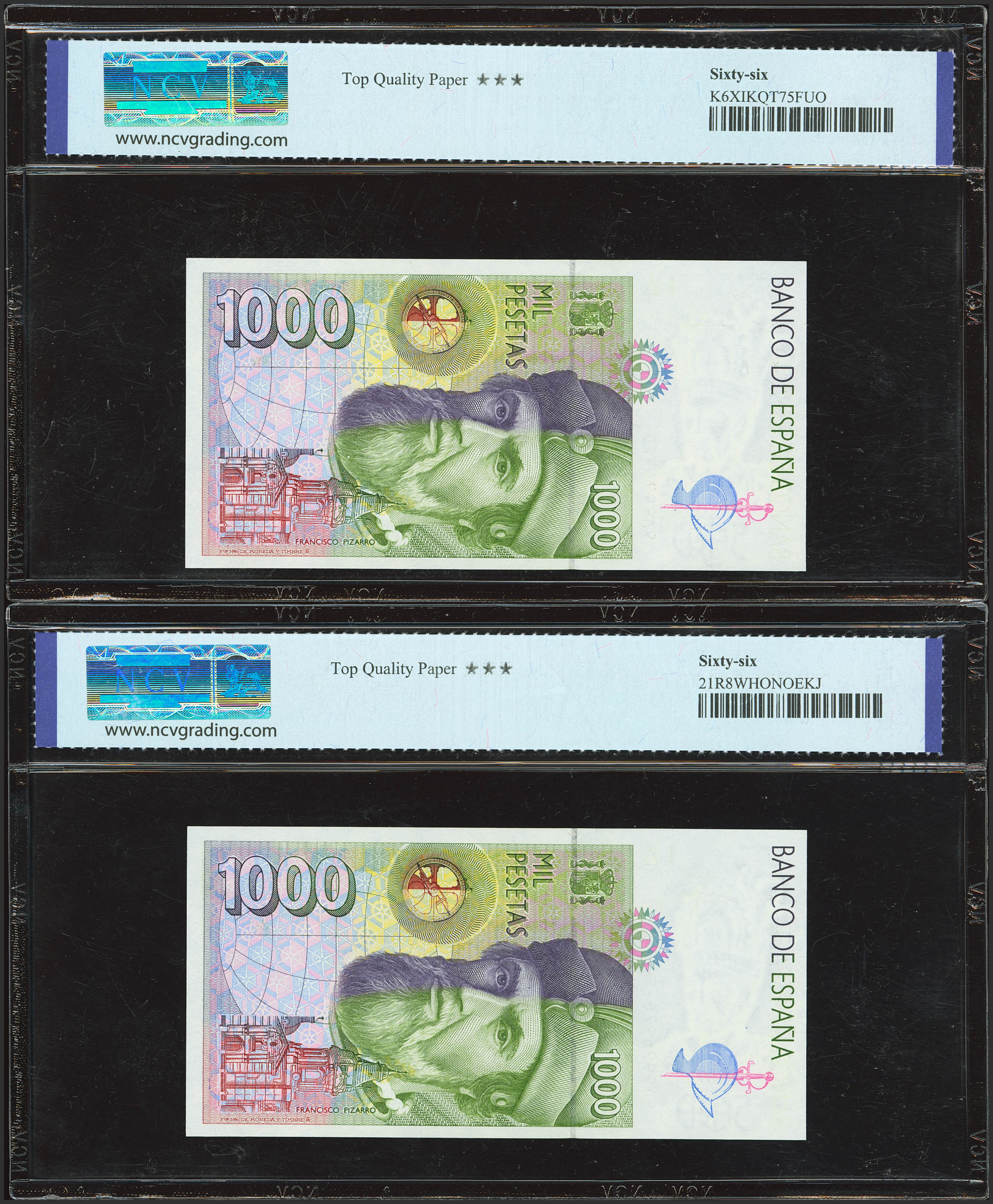 1000 Pesetas. 12 de Octubre de 1992. Pareja correlativa. Serie especial 9A. (Edifil 2023: 483c, Pick: 163*). SC. Encapsulados NCV66TPQ, ambos.