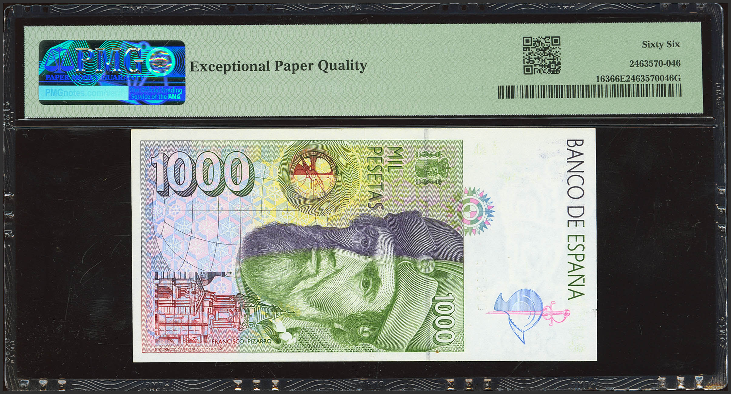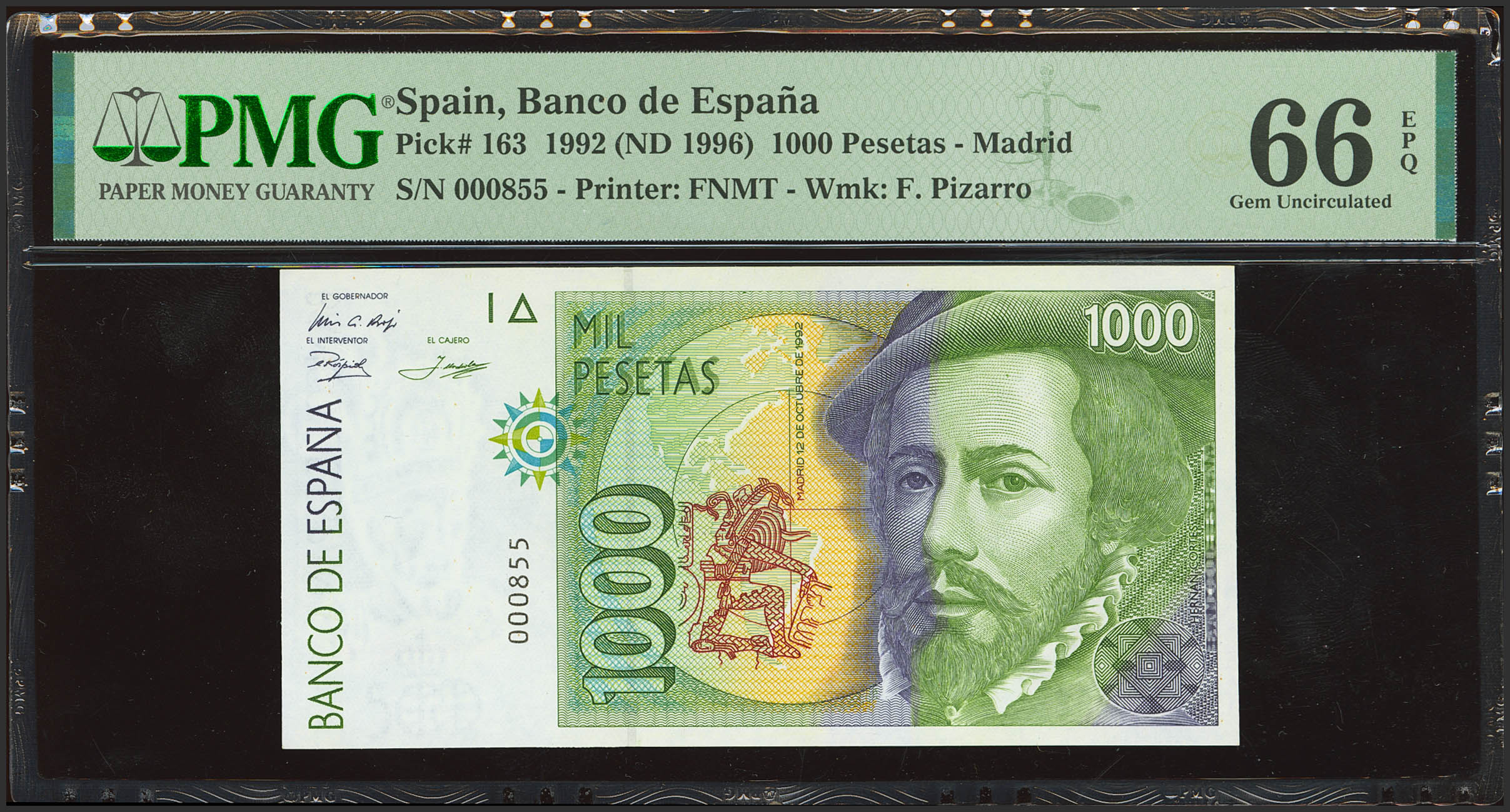 1000 Pesetas. 12 de Octubre de 1992. Sin serie y numeración bajísima (000855). (Edifil 2023: 483, Pick: 163). SC. Encapsulado PMG66EPQ.