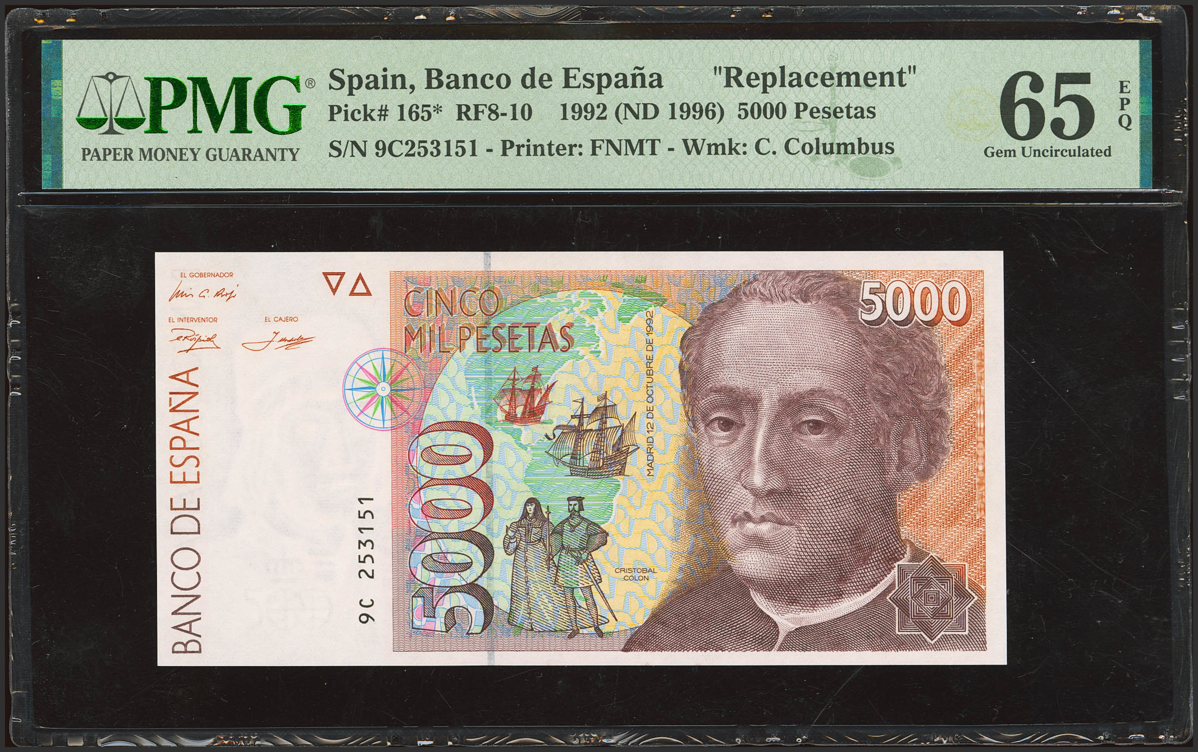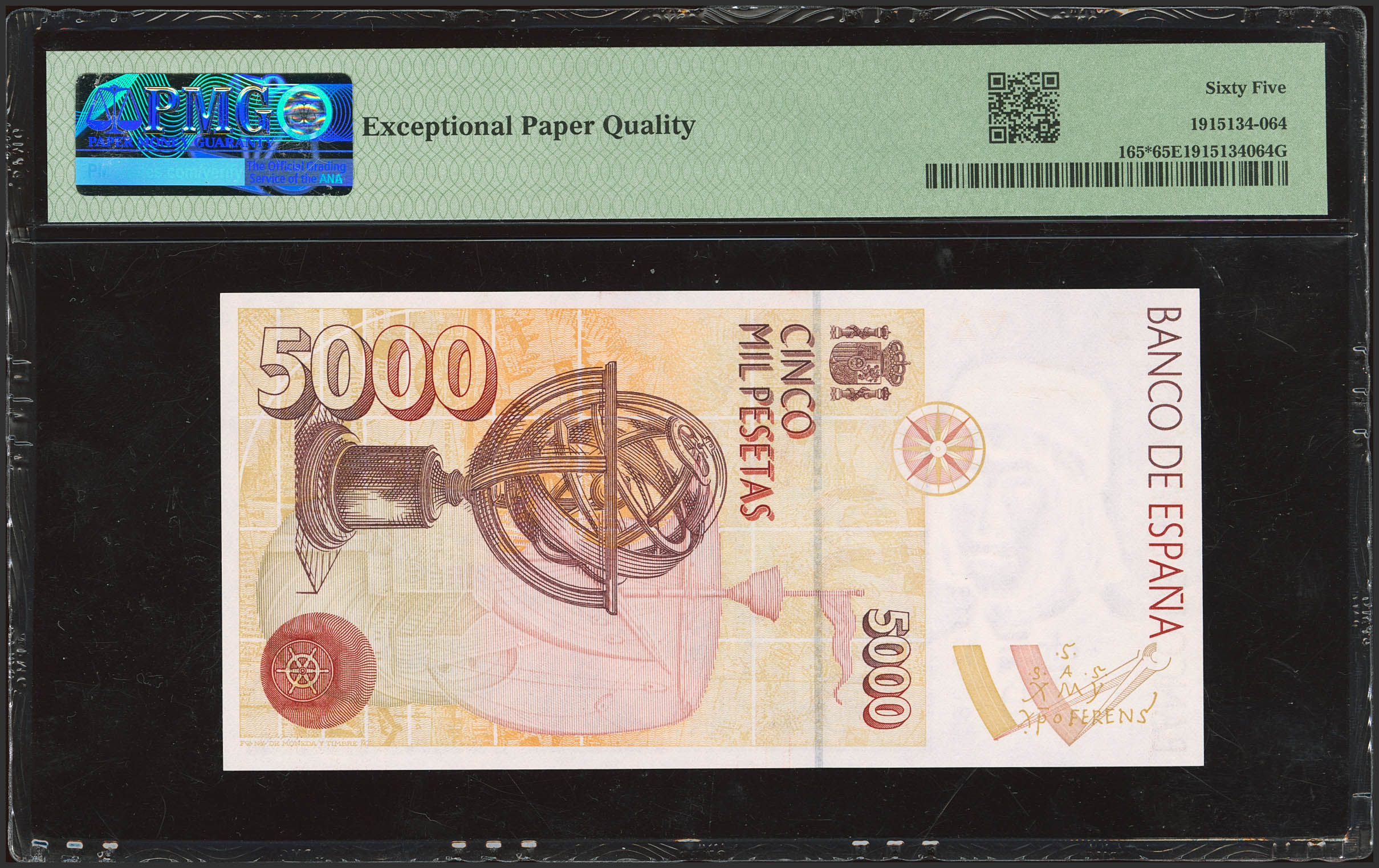 5000 Pesetas. 12 de Octubre de 1992. Serie especial 9C. (Edifil 2023: 484b, Pick: 165*). SC. Encapsulado PMG65EPQ.