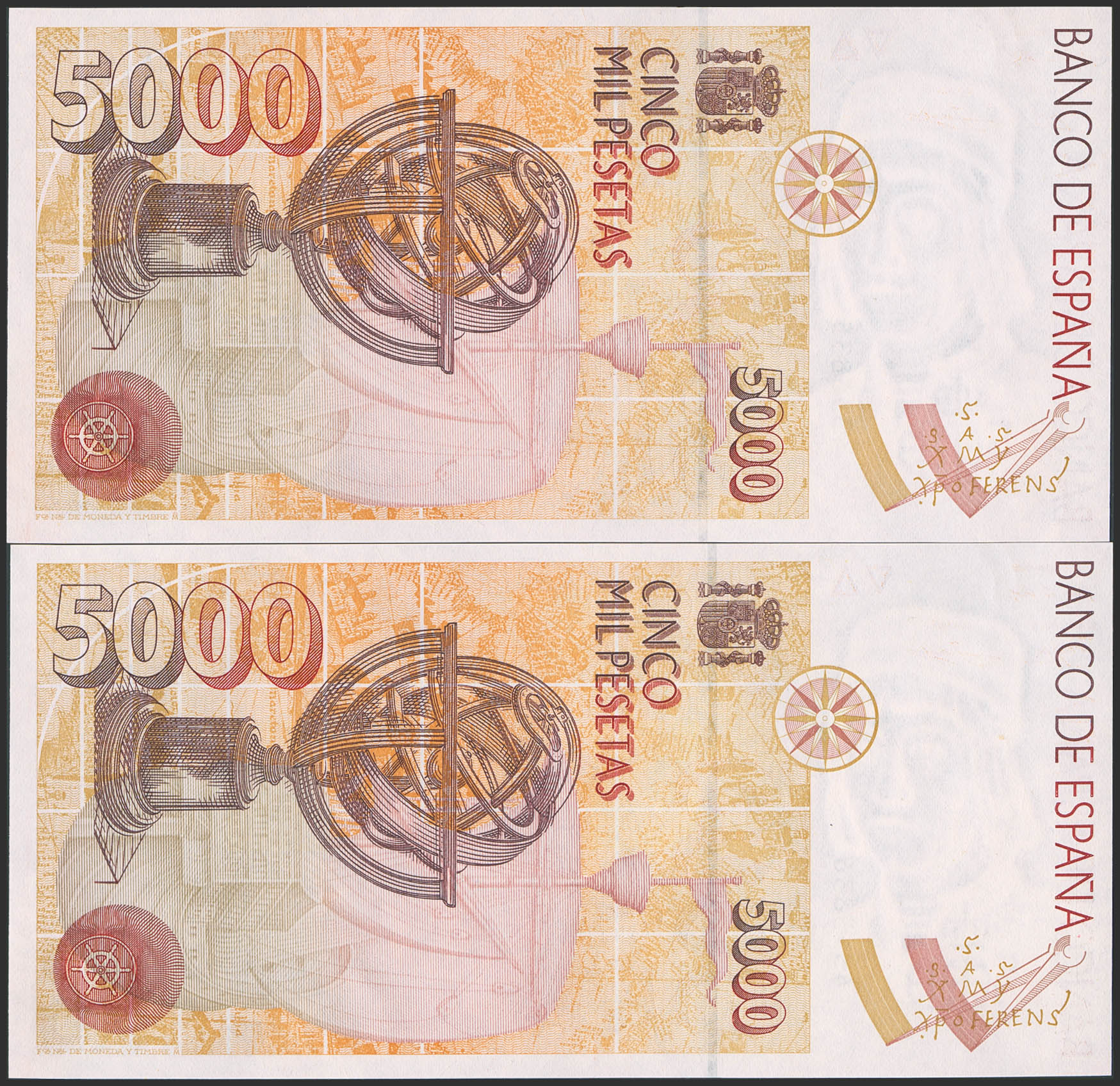 5000 Pesetas. 12 de Octubre de 1992. Pareja correlativa. Sin serie. (Edifil 2023: 484). SC-