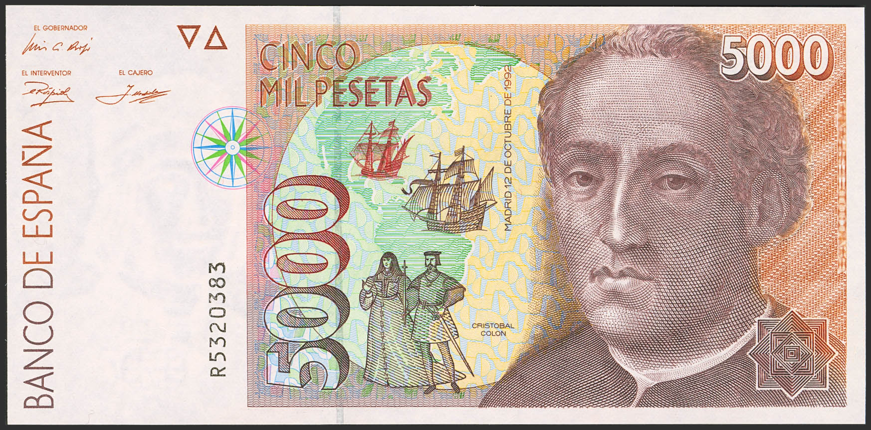 5000 Pesetas. 12 de Octubre de 1992. Serie R. (Edifil 2023: 484a). SC.