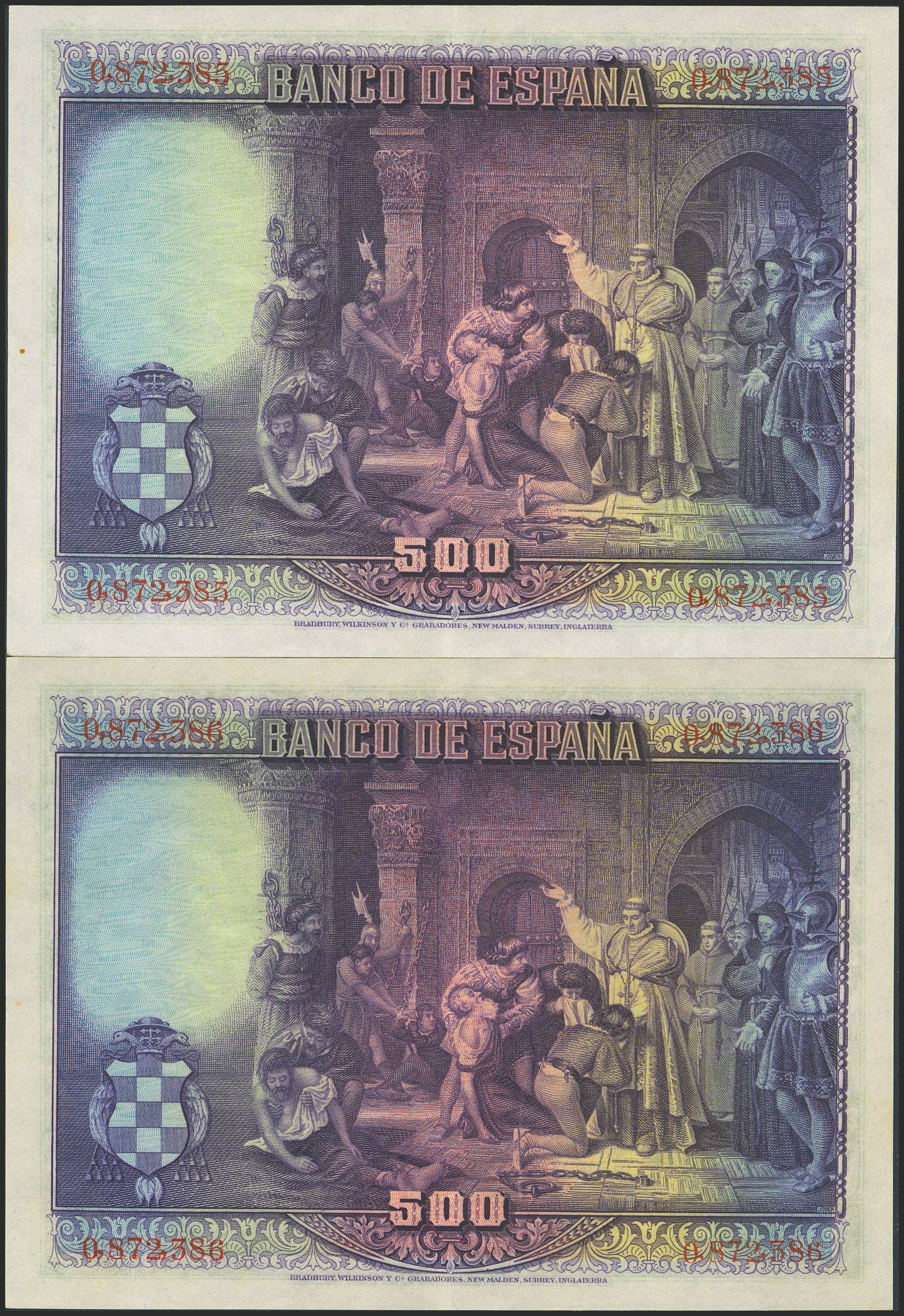 500 Pesetas. 15 de Agosto de 1928. Pareja correlativa. Sin serie. (Edifil 2023: 356). Conserva gran parte de su apresto original. EBC+.