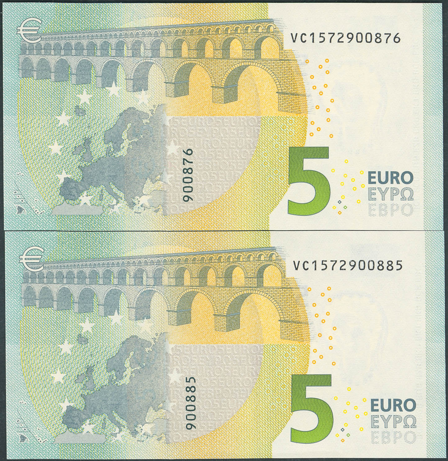 5 Euros. Noviembre 2019. Pareja correlativa (cabe recordar que el último dígito de todos los billetes denominados en euros es para control interno del Banco Central Europeo, el que marca la correlatividad de los billetes es el penúltimo dígito). Firma Lagarde. Serie V (España). (Edifil 2023: 493Aa). SC