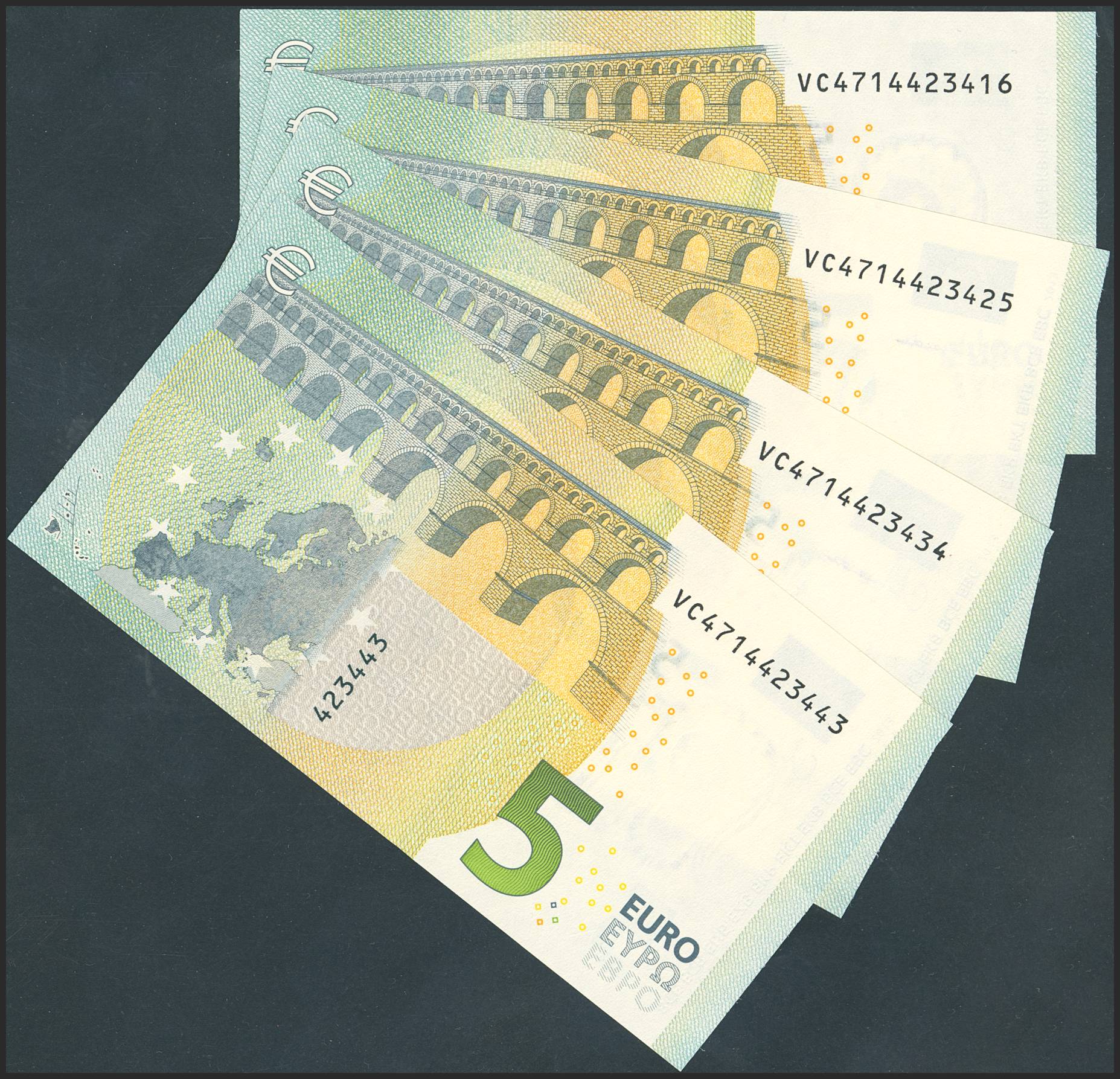 5 Euros. 2013. Cuatro billetes correlativos (cabe recordar que el último dígito de la numeración de todos los billetes denominados en euro es para el control interno del Banco Central Europeo, el que marca la correlatividad de los billetes es el penúltimo dígito). Firma Lagarde. Serie VC (España). (Edifil 2023: 493Aa). SC.