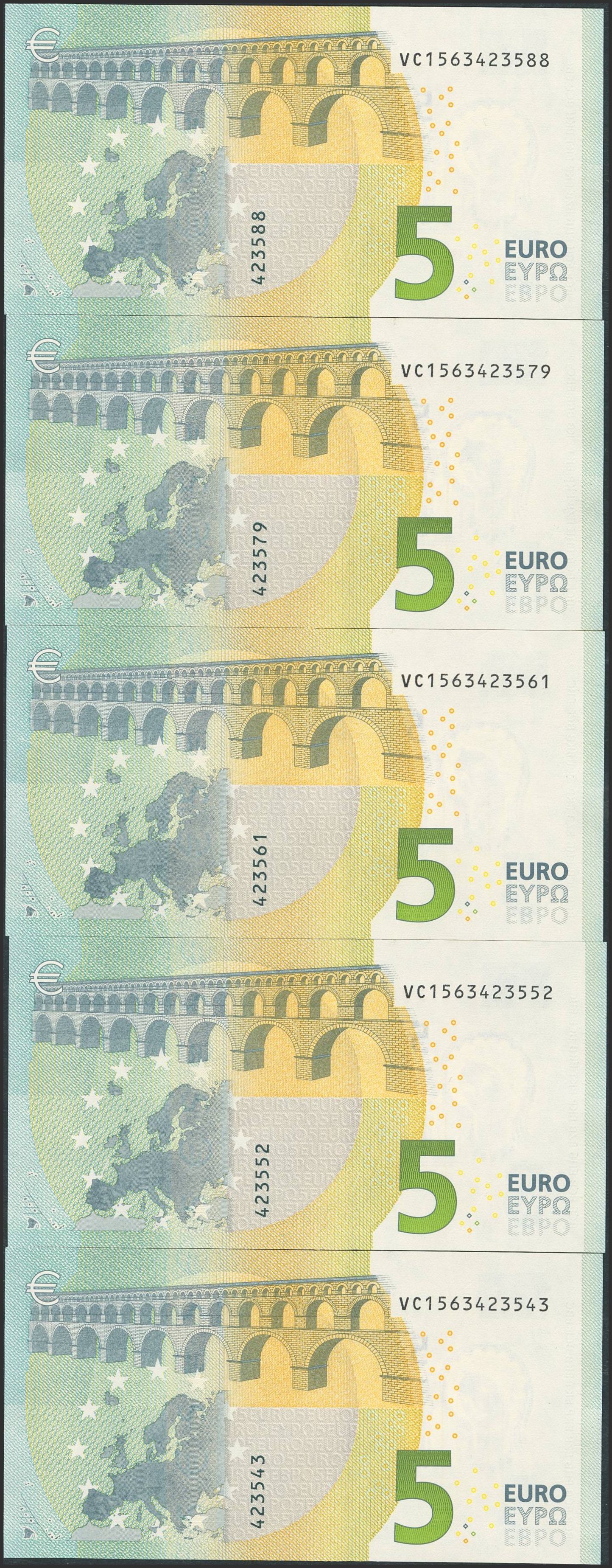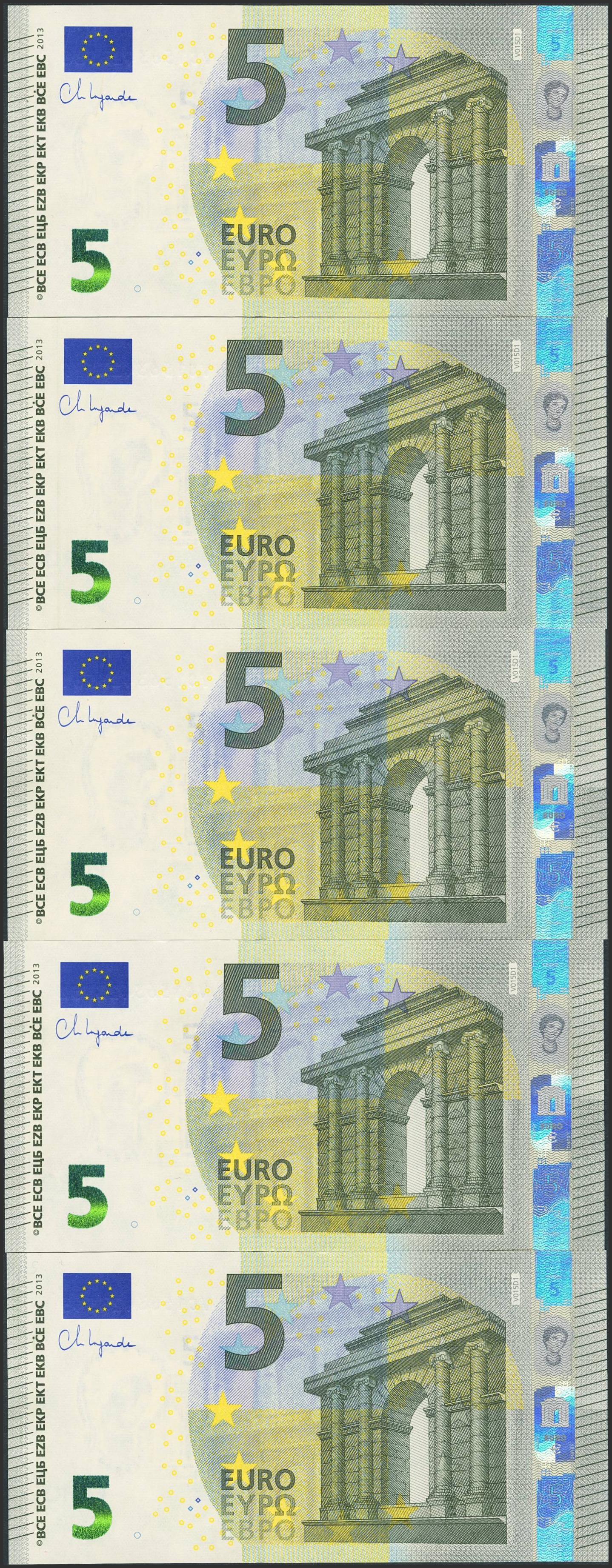 Conjunto de 5 billetes de 5 Euros todos ellos correlativos, emitidos el 2 de Mayo de 2013, (cabe recordar que el último dígito de la numeración de todos los billetes denominados en euros es para control interno del Banco Central Europeo, el que marca la correlatividad de los billetes es el penúltimo dígito) con la Firma Lagarde y la serie VC (España), (Edifil 2023: 493Aa). SC.