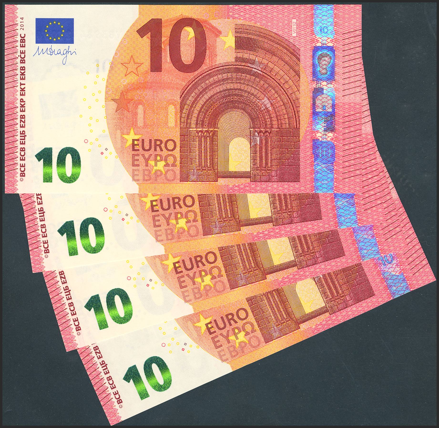10 Euros. 2014. Cuatro billetes correlativos (cabe recordar que el último dígito de la numeración de todos los billetes denominados en euro es para el control interno del Banco Central Europeo, el que marca la correlatividad de los billetes es el penúltimo dígito). Firma Draghi. Serie VB (España). (Edifil 2023: 494a, Pick: 21v). SC.
