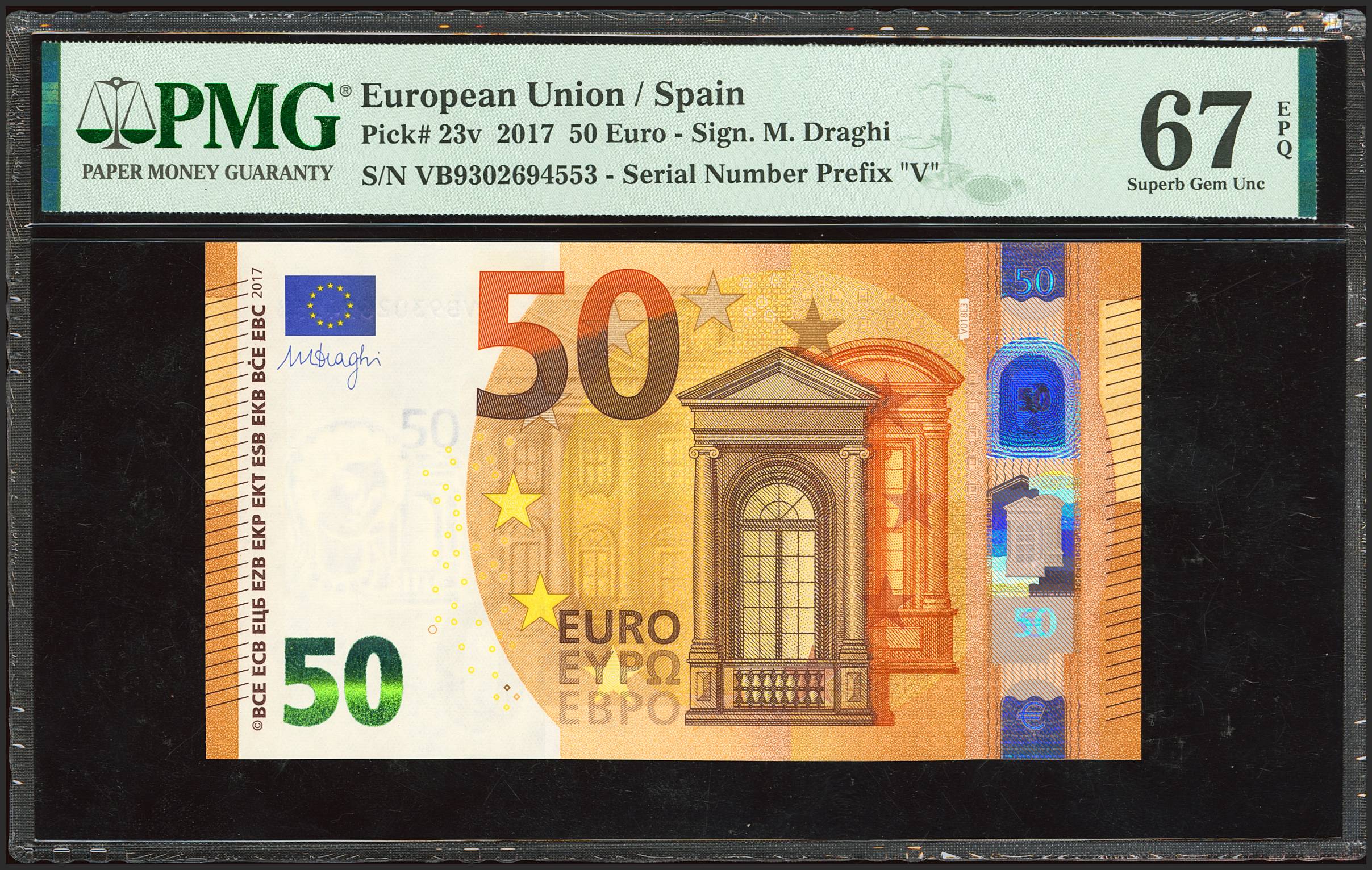 50 Euros. 2017. Firma Draghi. Serie V (España). (Edifil 2023: 496a, Pick: 23v). SC. Encapsulado PMG67EPQ.