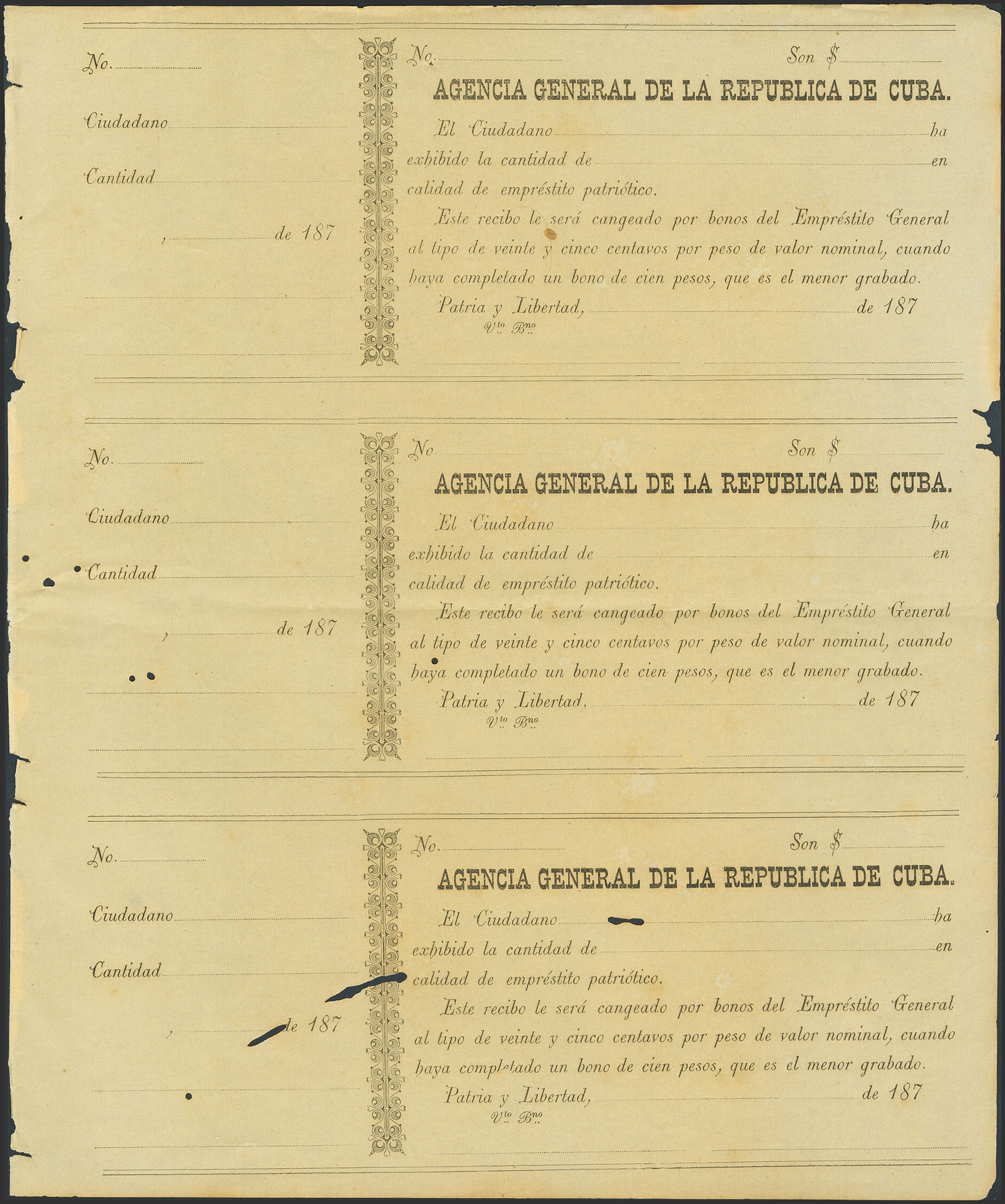 Conjunto de tres EMPRESTITOS PATRIOTICOS DE LA AGENCIA GENERAL DE LA REPUBLICA DE CUBA, sin guillotinar. (1870ca). Puntitos de "polilla". SC-.