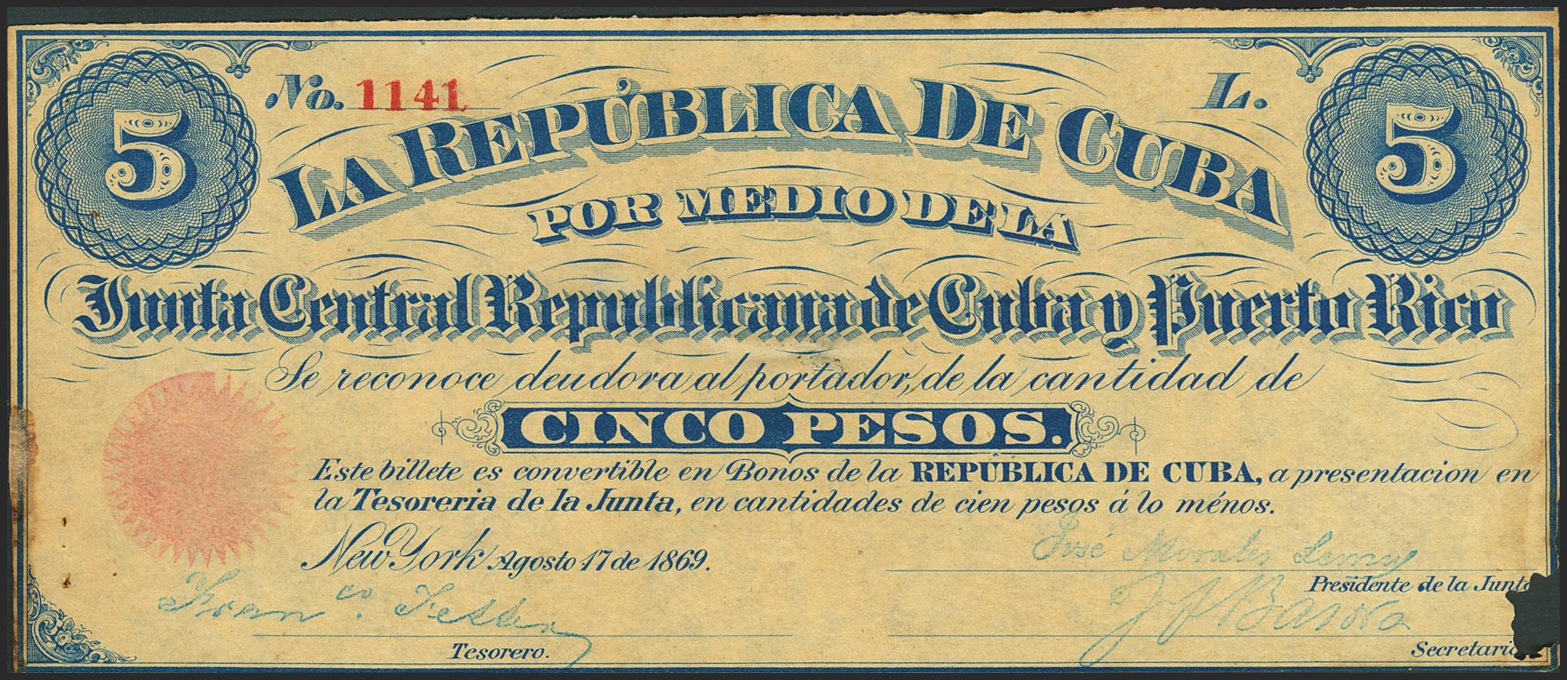 REPUBLICA DE CUBA. 5 Pesos. 17 de Agosto de 1869. Serie I. (Edifil 2023: 36, Pick: 62). Rarísimo en esta excepcional calidad. EBC.