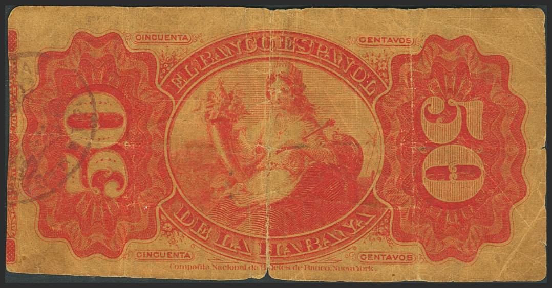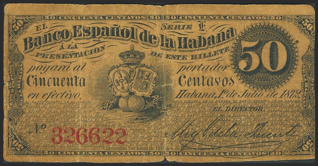 EL BANCO ESPAÑOL DE LA HABANA. 50 Centavos. 1 de Julio de 1872, primera fecha emitida. Serie E. (Edifil 2023: 49). BC.