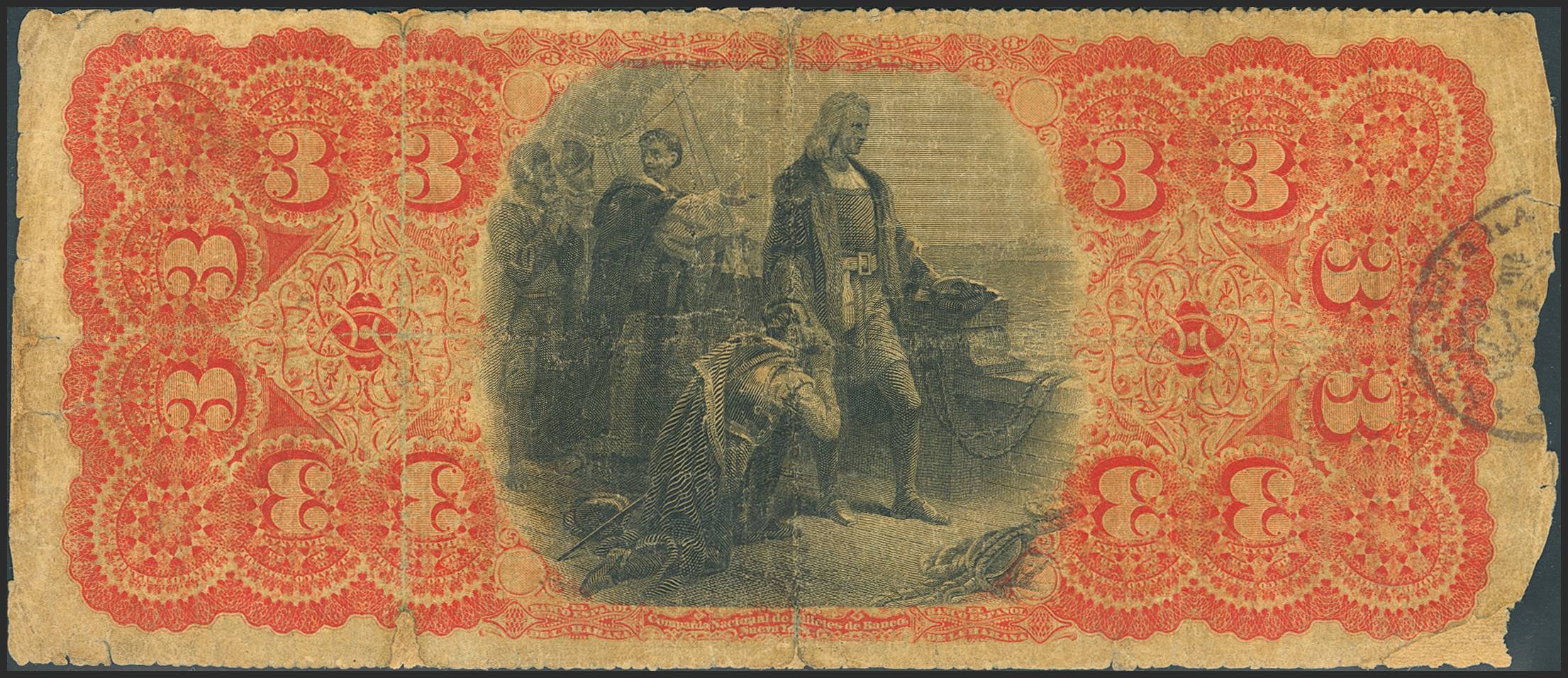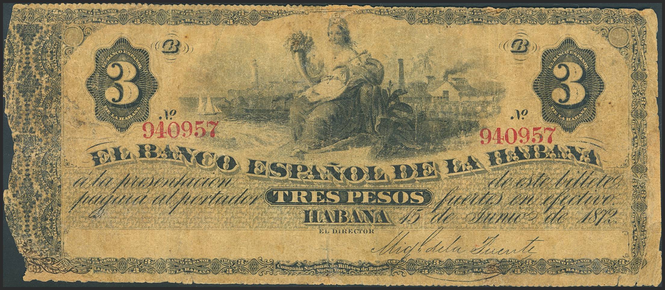 EL BANCO ESPAÑOL DE LA HABANA. 3 Pesos. 15 de Junio de 1872, primera fecha emitida. Serie B. (Edifil 2023: 56). Rarísimo, mínimamente reparado. BC.