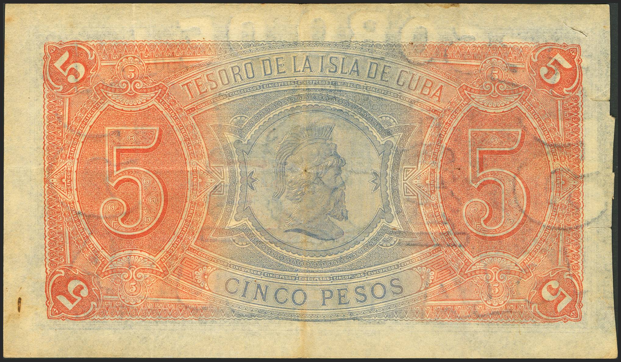 BANCO ESPAÑOL DE LA ISLA DE CUBA. 5 Pesos. 12 de Agosto de 1891. Sin serie y sin firmas como los ejemplares conocidos. (Edifil 2023: 63). Raro, puntitos de aguja. MBC-.
