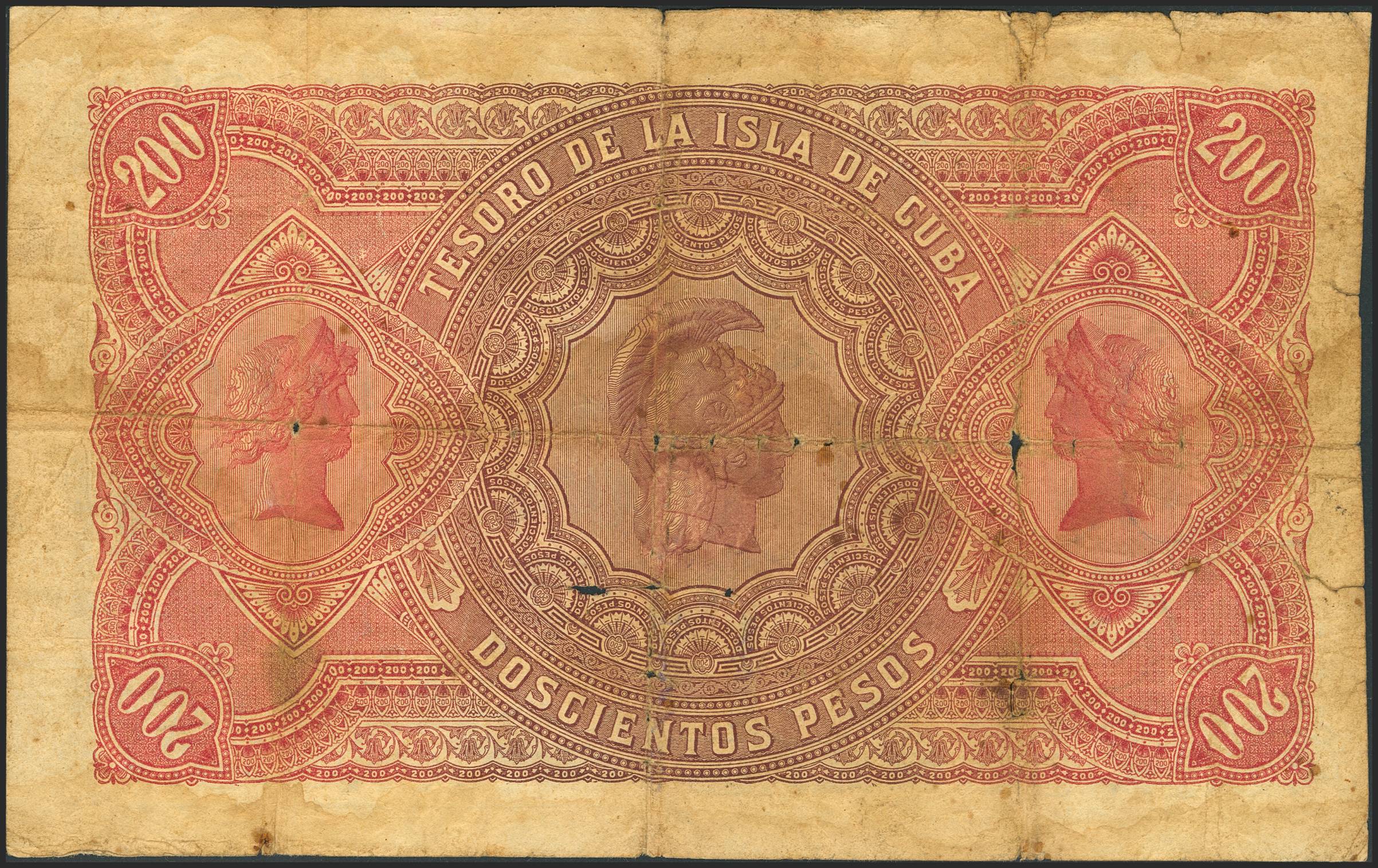 BANCO ESPAÑOL DE LA ISLA DE CUBA. 200 Pesos. 12 de Agosto de 1891. Sin serie, numeración bajísima y sin firmas como los ejemplares conocidos de esta emisión. (Edifil 2023: 68). Rarísimo y reparado. RC.