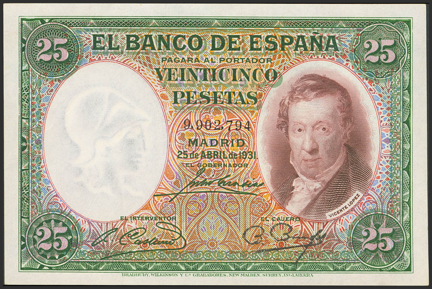25 Pesetas. 25 de Abril de 1931. Sin serie. (Edifil 2023: 358). Apresto original. SC-.