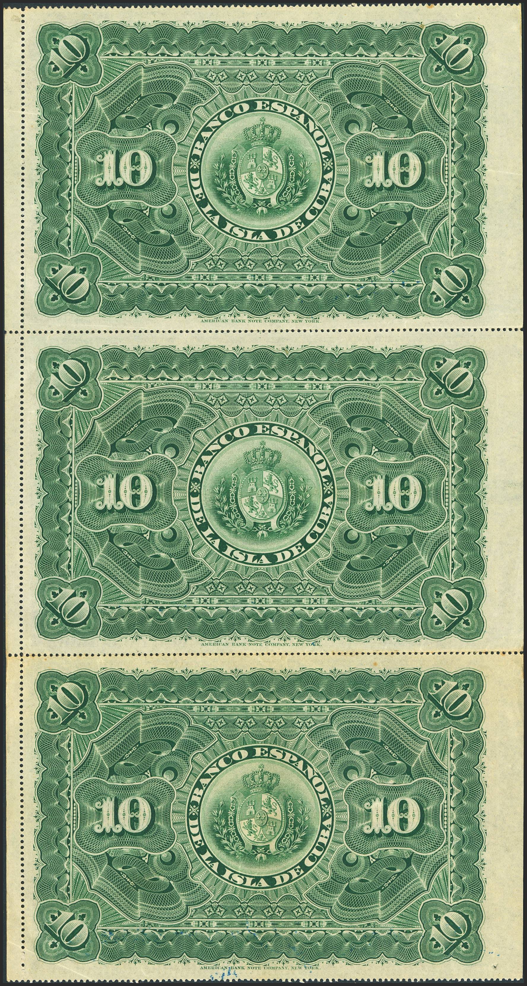 BANCO ESPAÑOL DE LA ISLA DE CUBA. Conjunto de 3 billetes de 10 Pesos (sin desprender), emitidos el 15 de Mayo de 1896, fechados con estampilla, serie E. (Edifil 2023: 73a). Raro, apresto original. EBC+++.