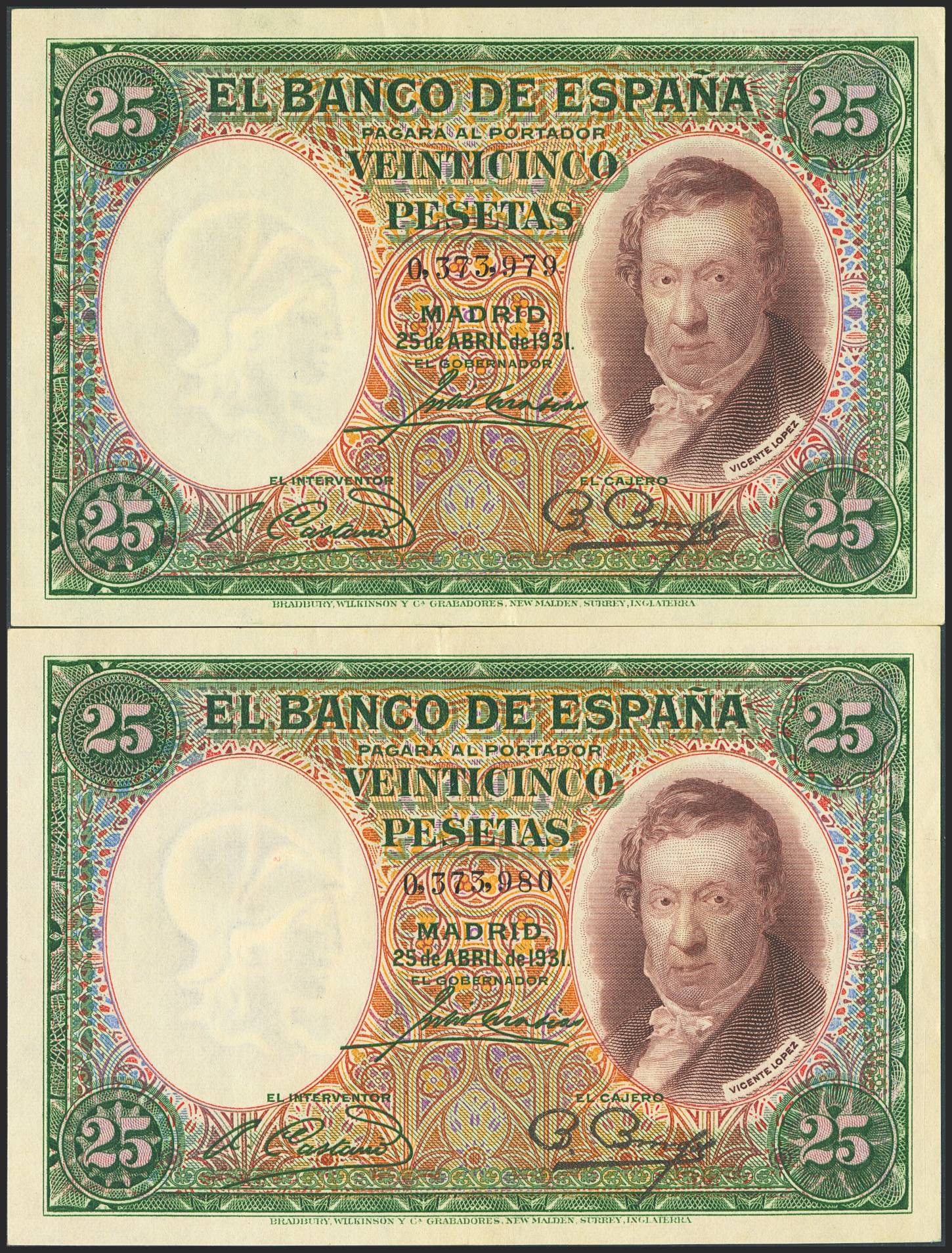 25 Pesetas. 25 de Abril de 1931. Pareja correlativa. Sin serie. (Edifil 2023: 358). Apresto original. EBC.