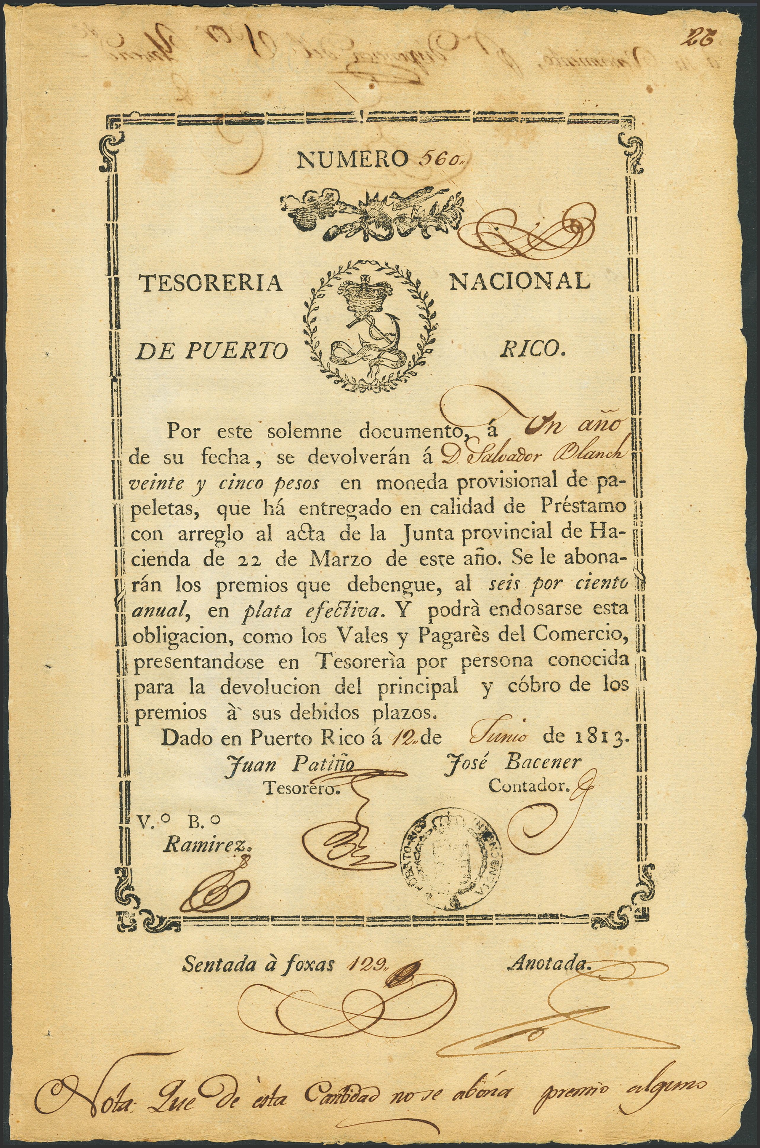 PUERTO RICO. 25 Pesos. 12 de Junio de 1813. Real Tesorería. Sin serie. (Edifil 2023: 4). Muy raro. SC--.