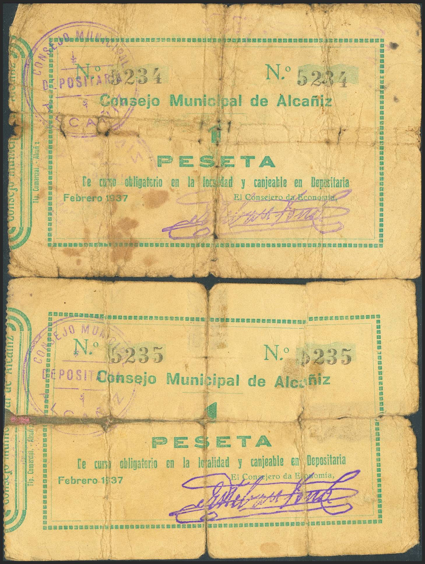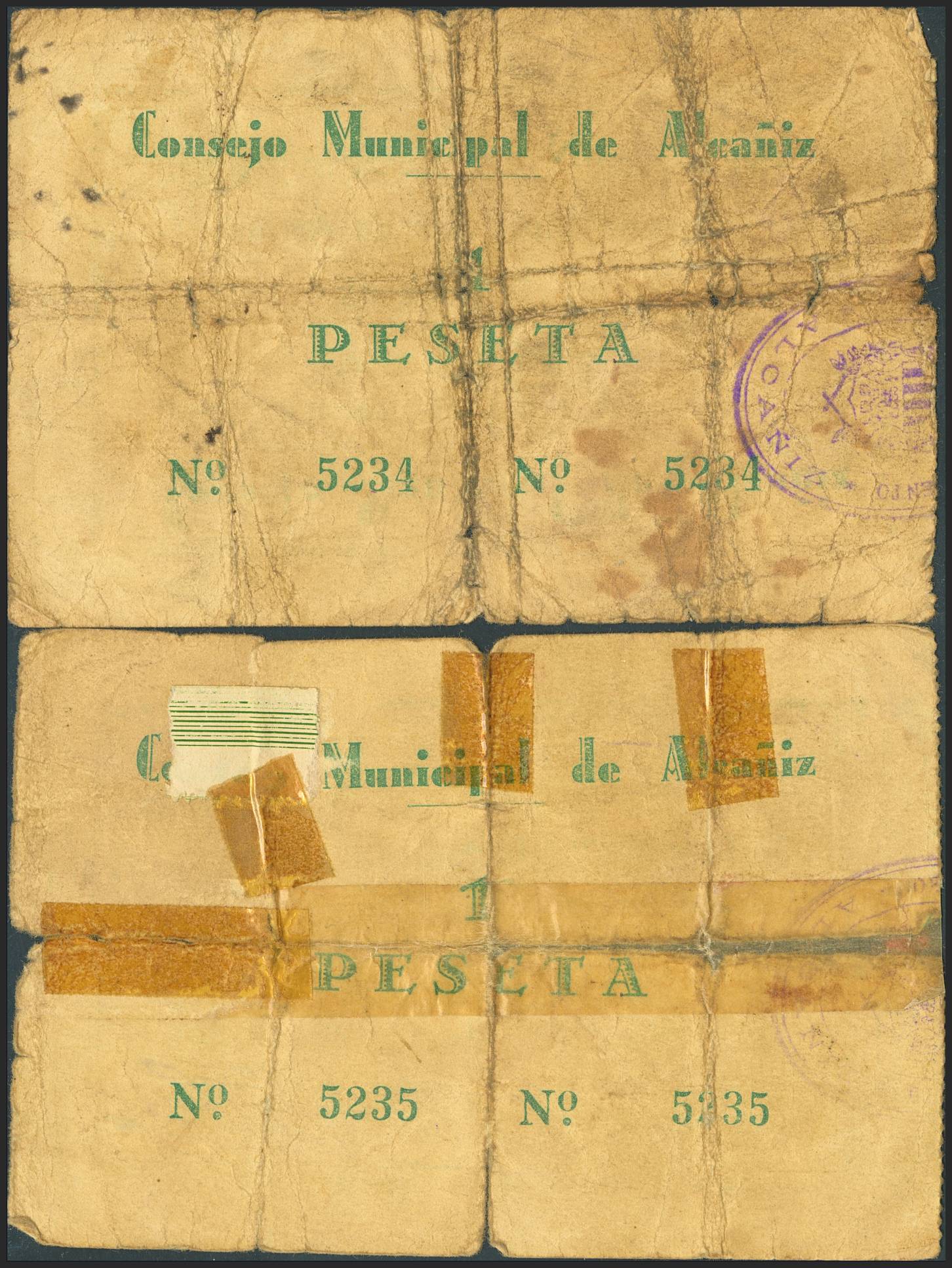 ALCAÑIZ (TERUEL). 1 Peseta. Febrero 1937. Pareja correlativa. Sin serie. (González: 295). Inusual pareja, reforzada con cinta adhesiva. RC-.