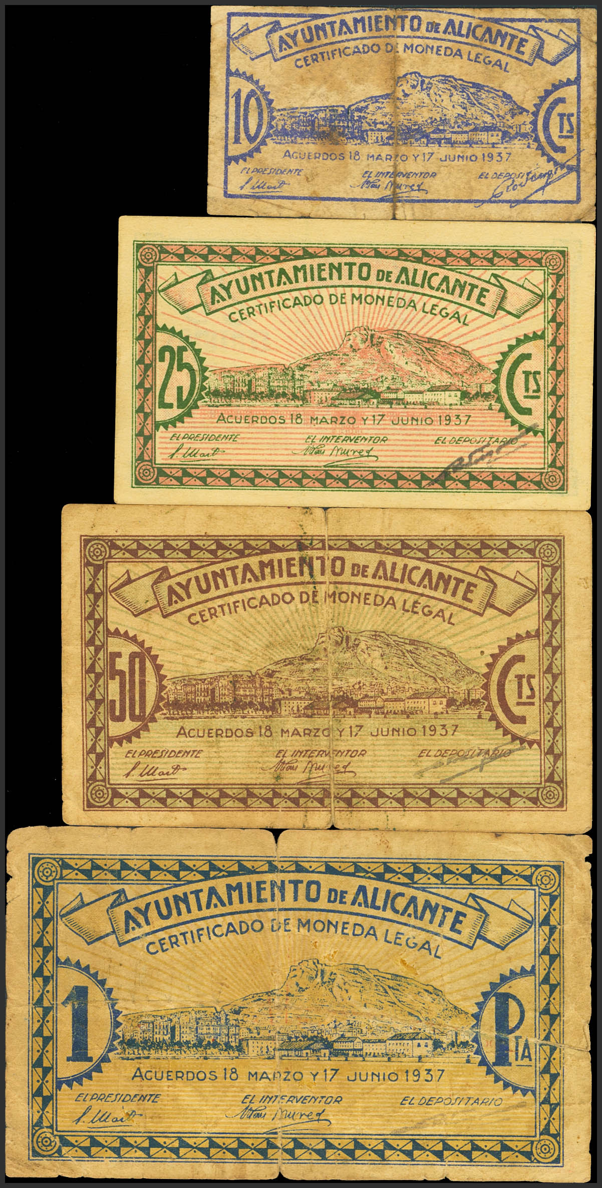 ALICANTE. 10 Céntimos, 25 Céntimos, 50 Céntimos y 1 Peseta. 17 de Junio de 1937. Sin serie, serie C, serie B y serie A. (González: 507/10). Serie completa. BC/RC.