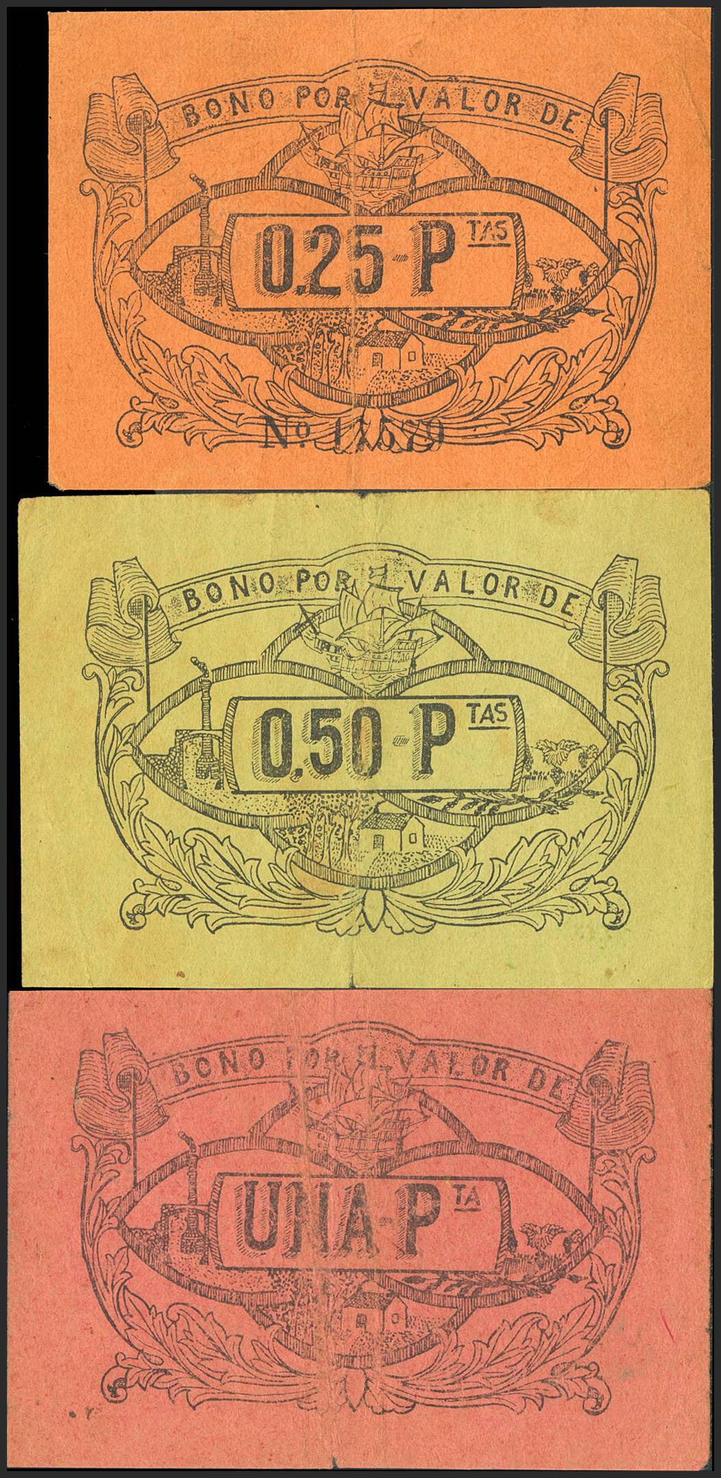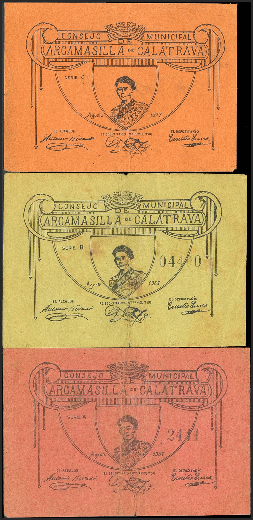 ARGAMASILLA DE CALATRAVA (CIUDAD REAL). 25 Céntimos, 50 Céntimos y 1 Peseta. Agosto de 1937. Series C, B y A, respectivamente. (González: 769/71). Inusual serie completa. MBC.