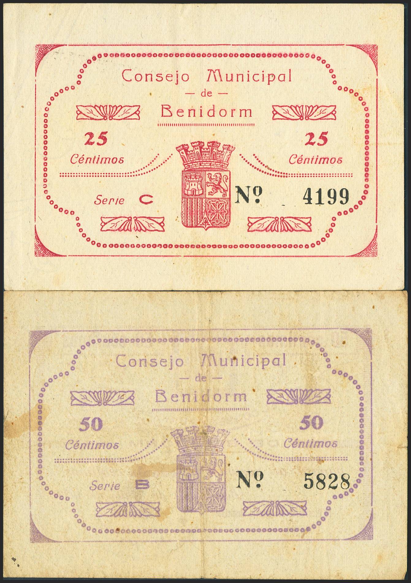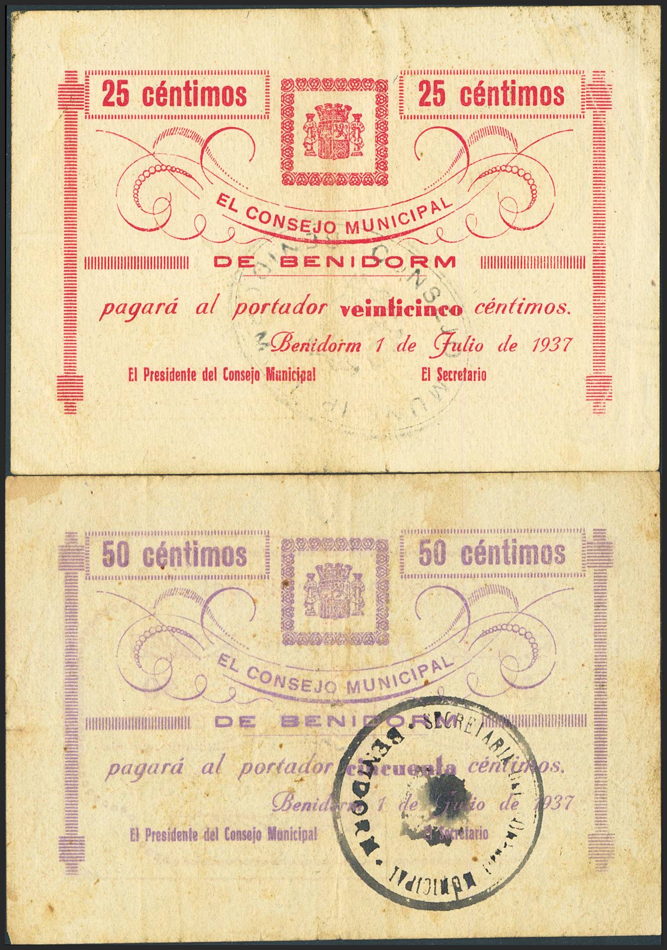 BENIDORM (ALICANTE). 25 Céntimos y 50 Céntimos. 1 de Julio de 1937. Serie C y B, respectivamente. (González: 1093, 1094). Inusuales. MBC.