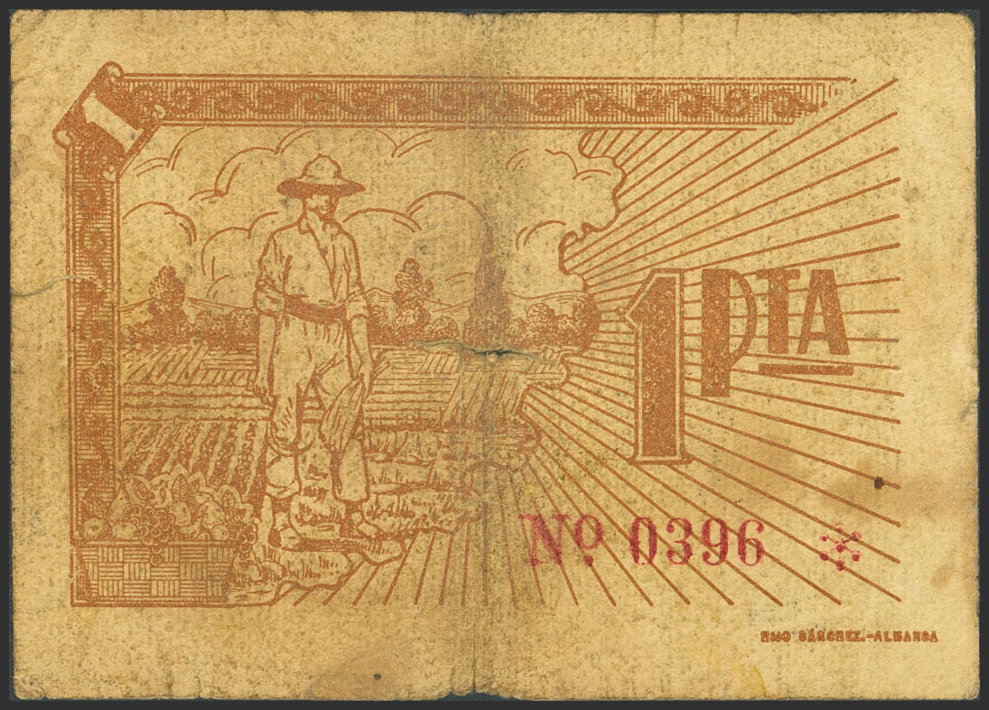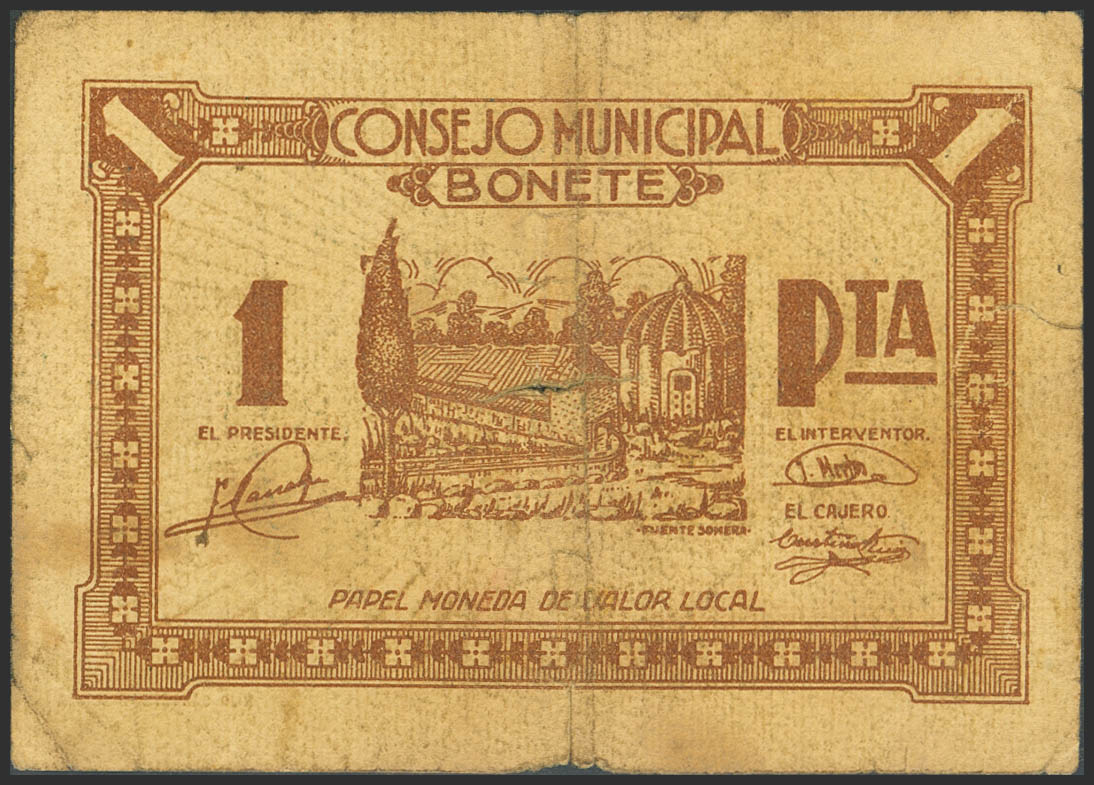 BONETE (ALBACETE). 1 Peseta. (1937ca). (González: 1279). Raro. BC-.