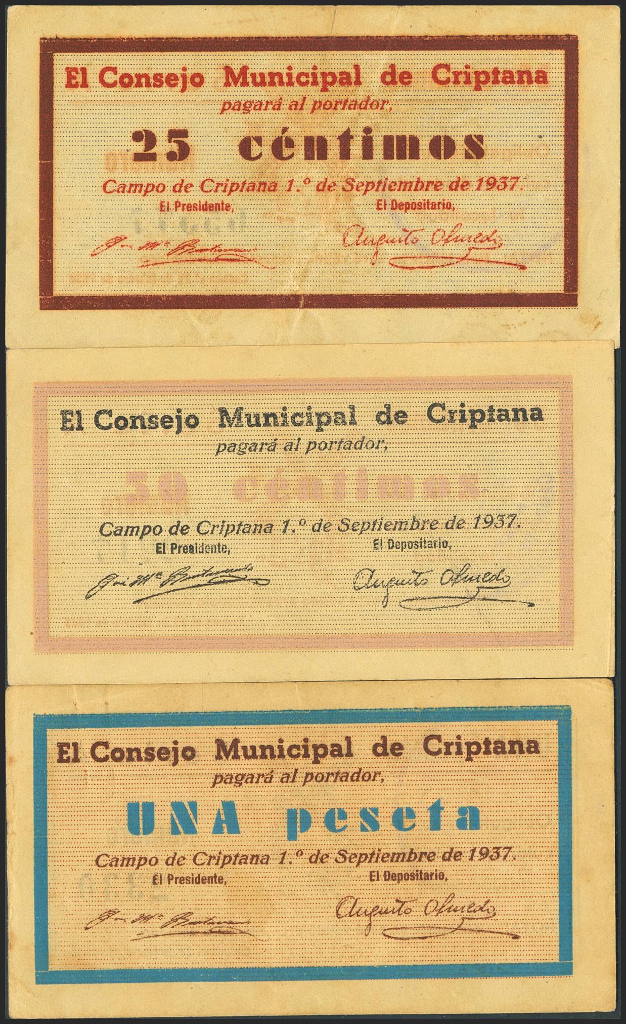 CRIPTANA (CIUDAD REAL). 25 Céntimos, 50 Céntimos y 1 Peseta. 1 de Junio de 1937. Serie A. (González: 2096/98). Inusual serie completa. SC--/MBC+.