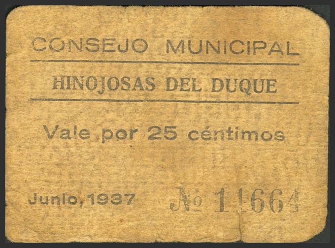 HINOJOSA DEL DUQUE (CORDOBA). 25 Céntimos. Junio de 1937. Sin serie. (González: 2862). Raro. EBC.