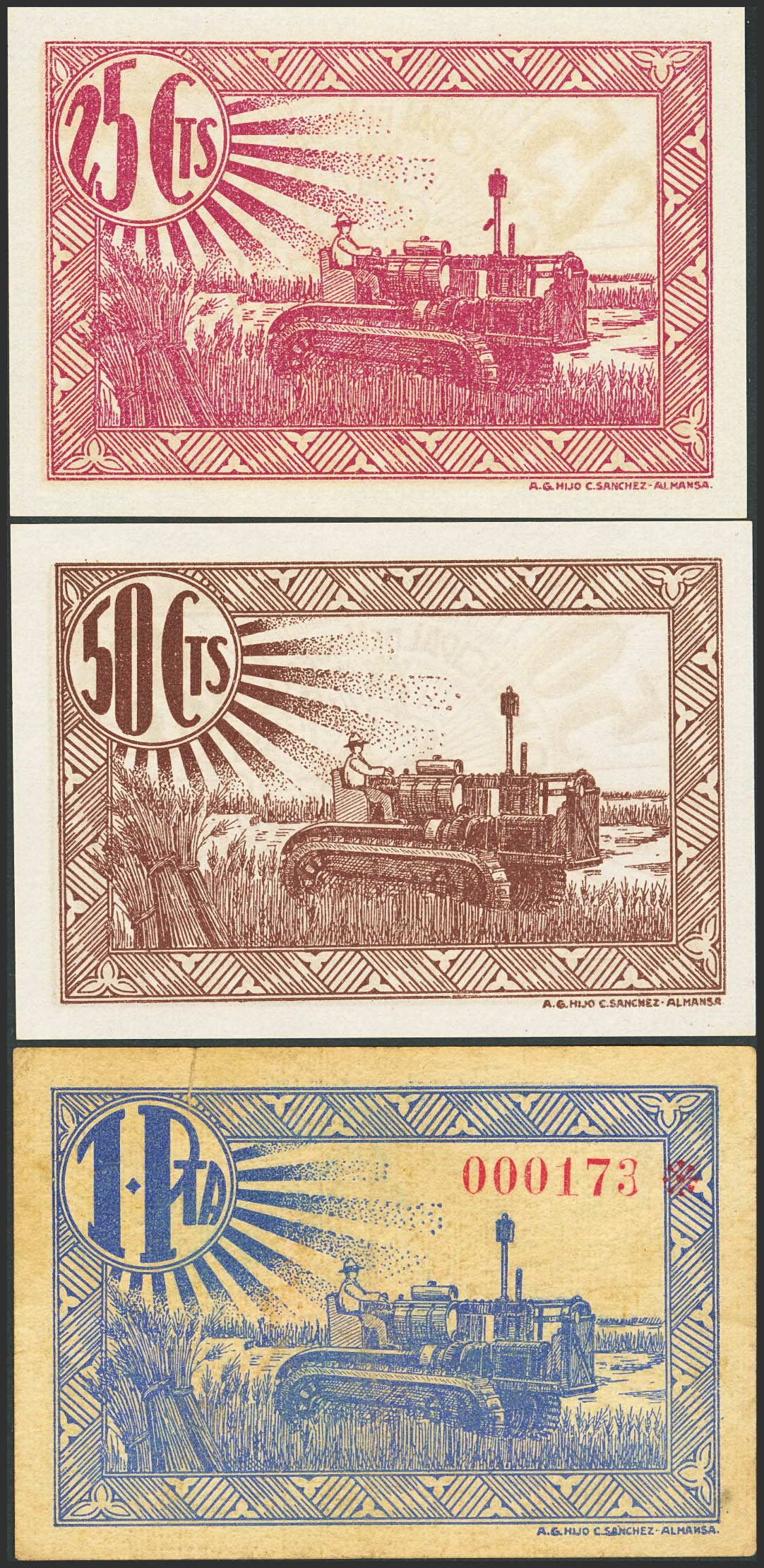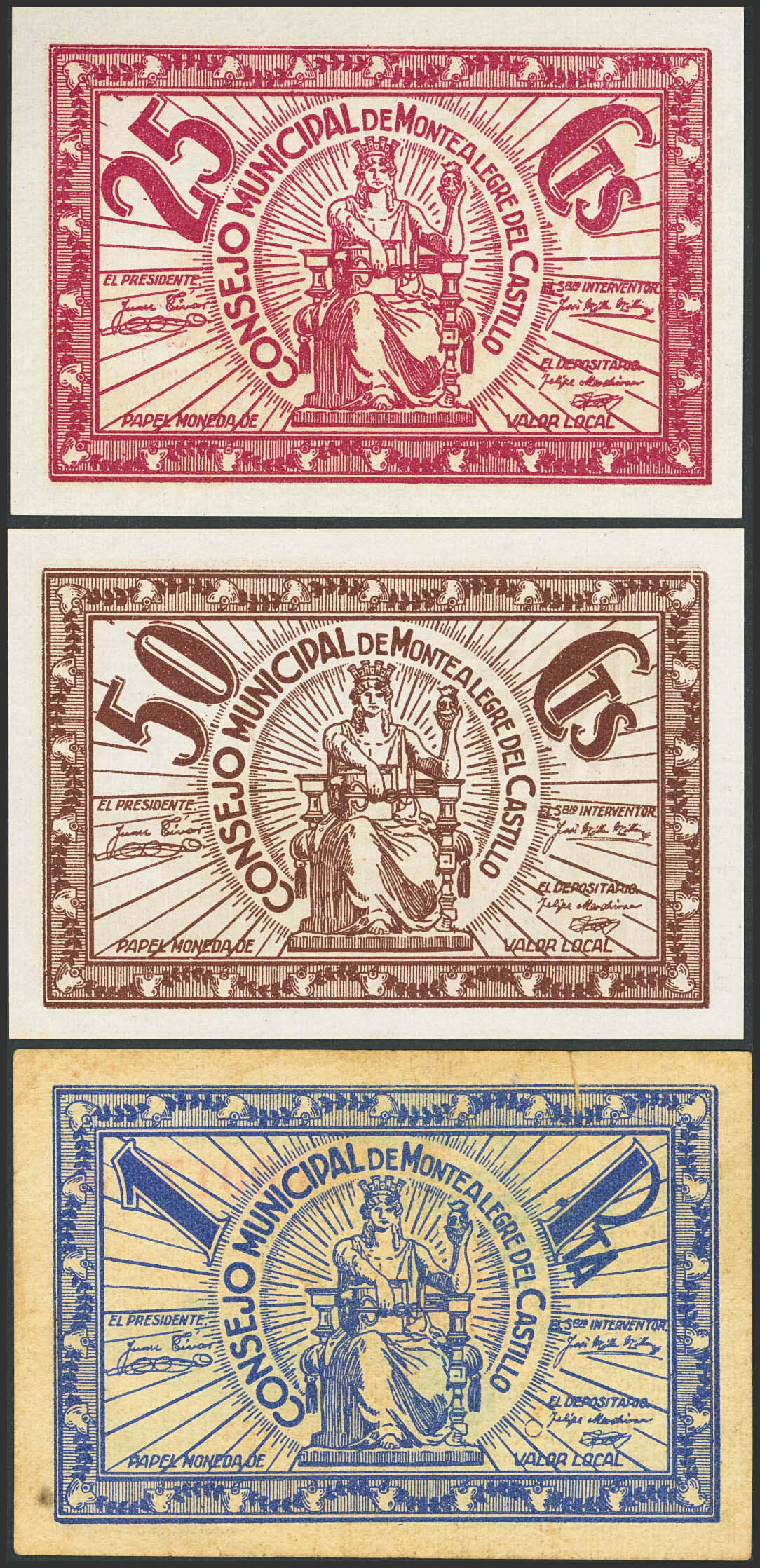 MONTEALEGRE DEL CASTILLO (ALBACETE). 25 Céntimos, 50 Céntimos y 1 Peseta. (1937ca). (González: 3639/41). Inusual serie completa. SC-/MBC.
