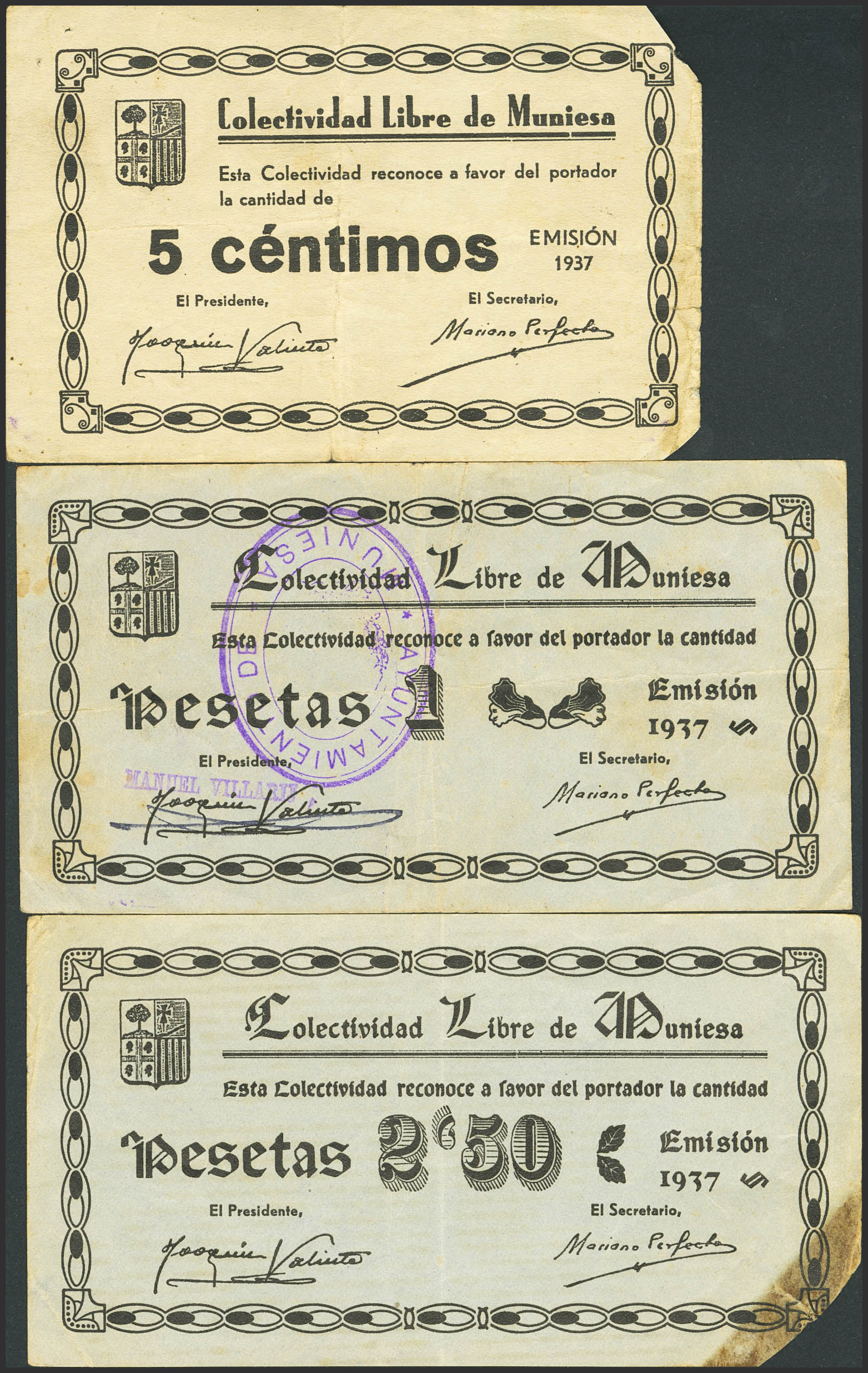 MUNIESA (TERUEL). 5 Céntimos, 1 Peseta y 2´5 Pesetas. (1937ca). (González: 3761, 3764, 3766). Raro. BC/MBC-.