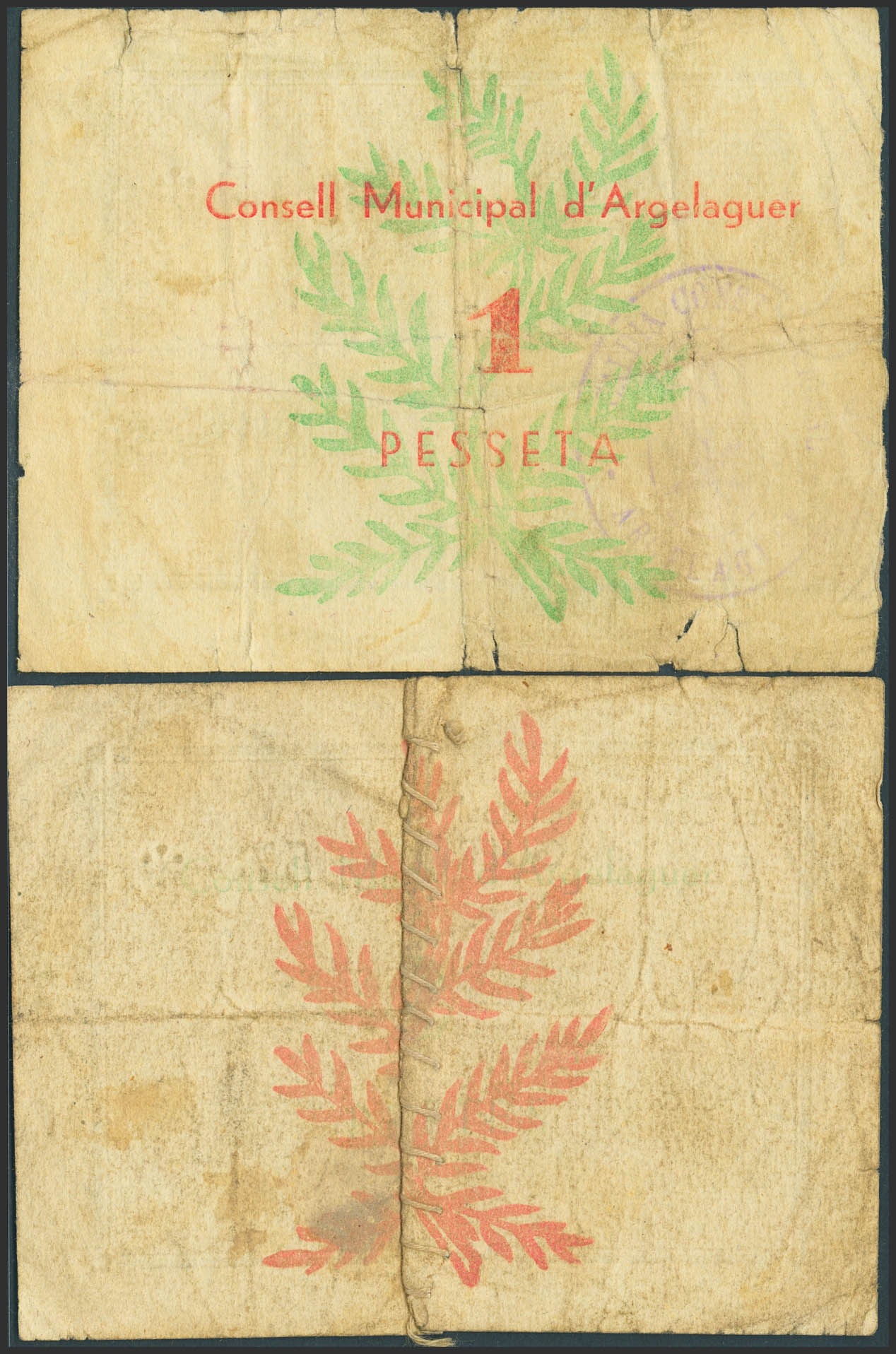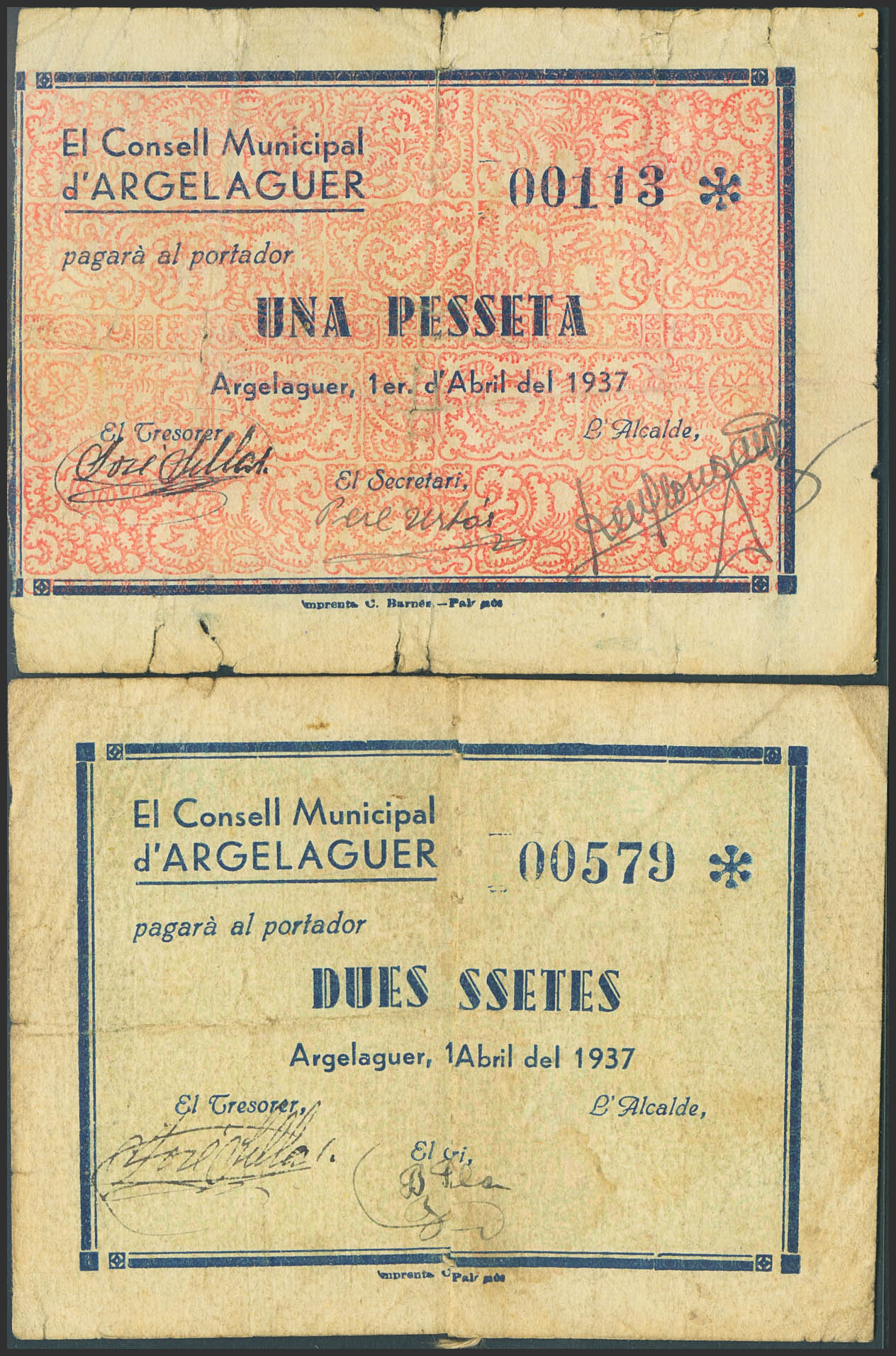 ARGELAGER (GERONA). 1 Peseta y 2 Pesetas. 1 de Abril de 1937. (González: 6377/78). Muy rara serie completa, 2 pts unido con hilo. BC+/RC.