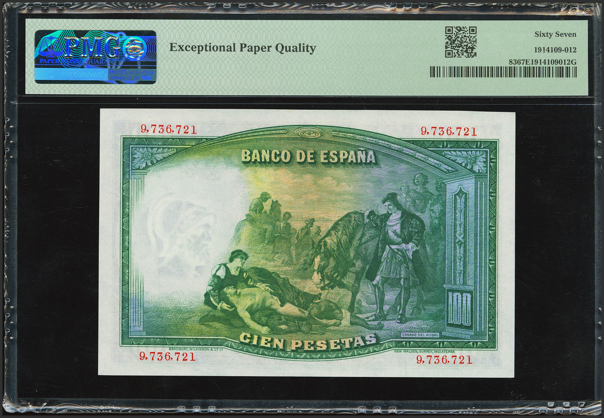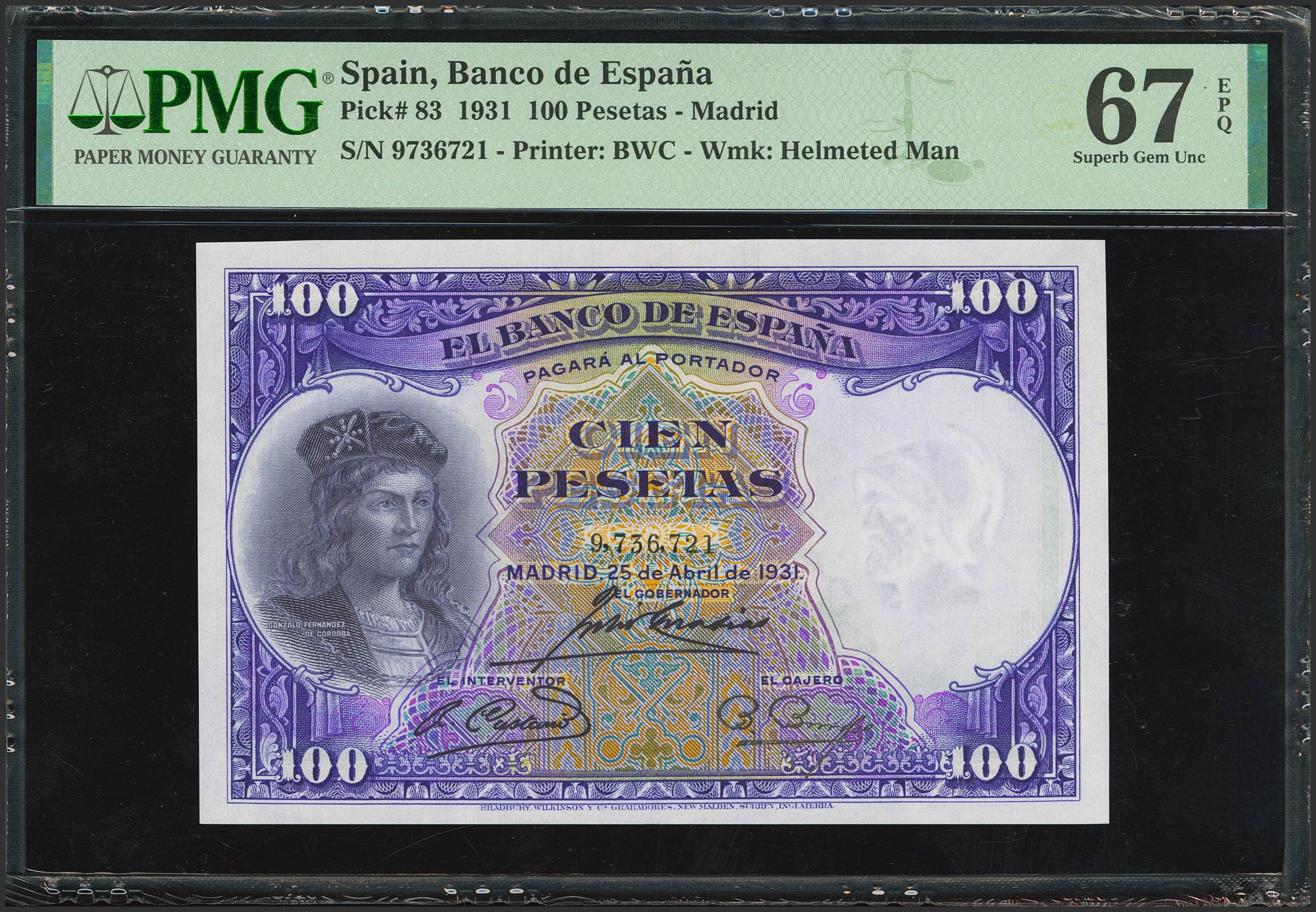 100 Pesetas. 25 de Abril de 1931. Sin serie. (Edifil 2021: 360, Pick: 83). Raro en esta excepcional calidad, apresto original. SC. Encapsulado PMG67EPQ.